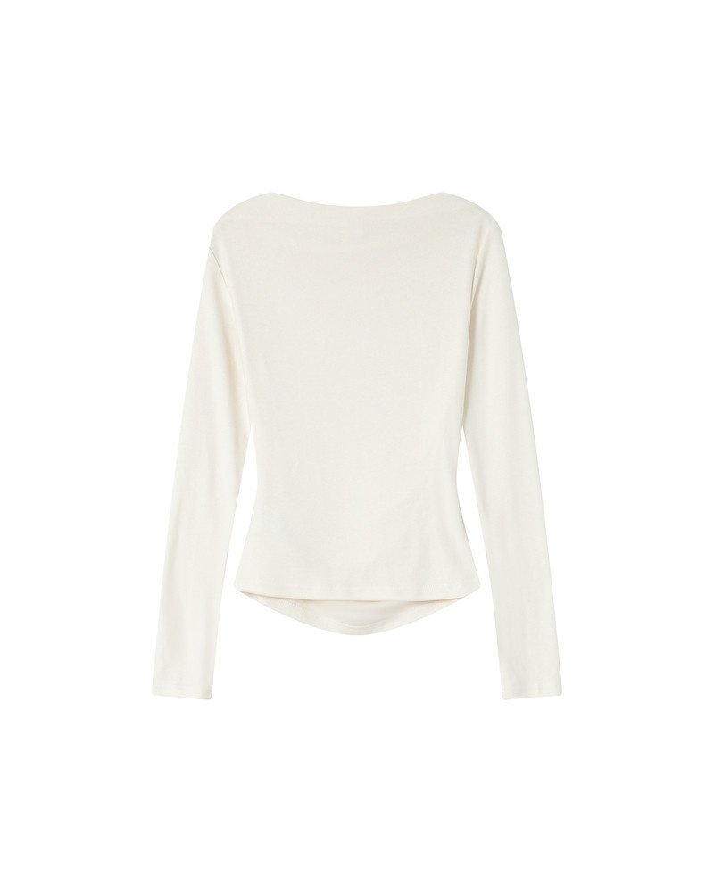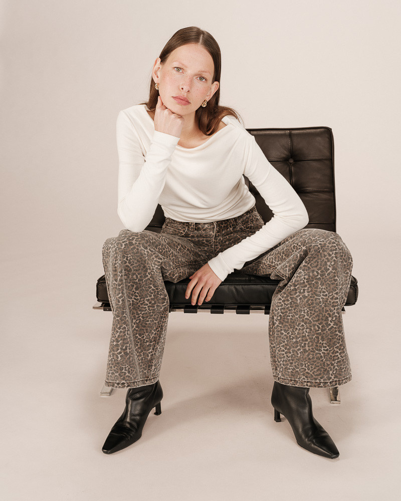 Complete the look: The SIOUX draped top is worn with JAMES wide-leg jeans or SACHA oversized jeans. Minimalist and contemporary outfits.