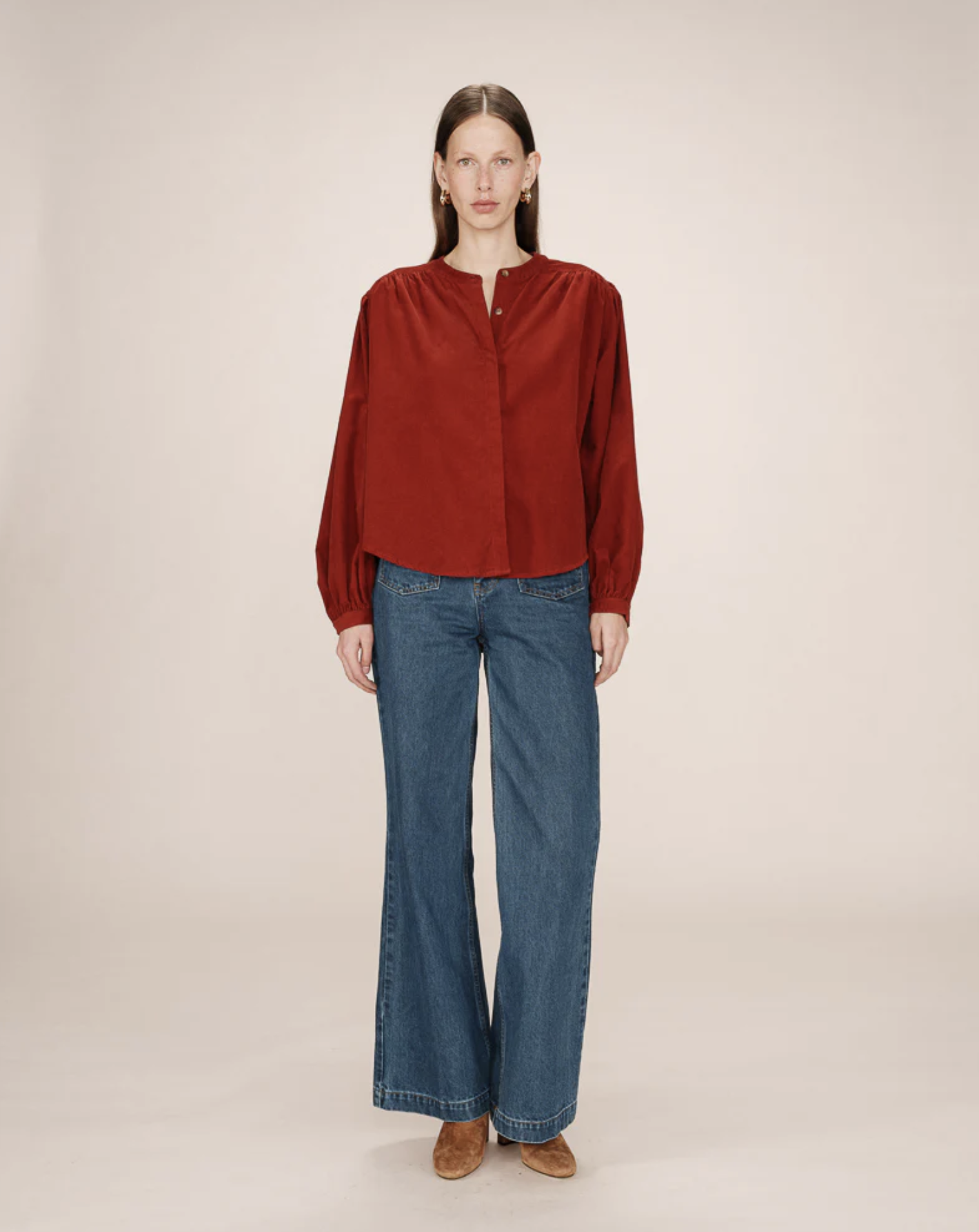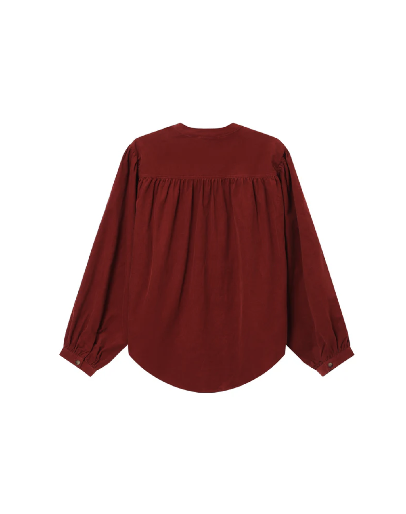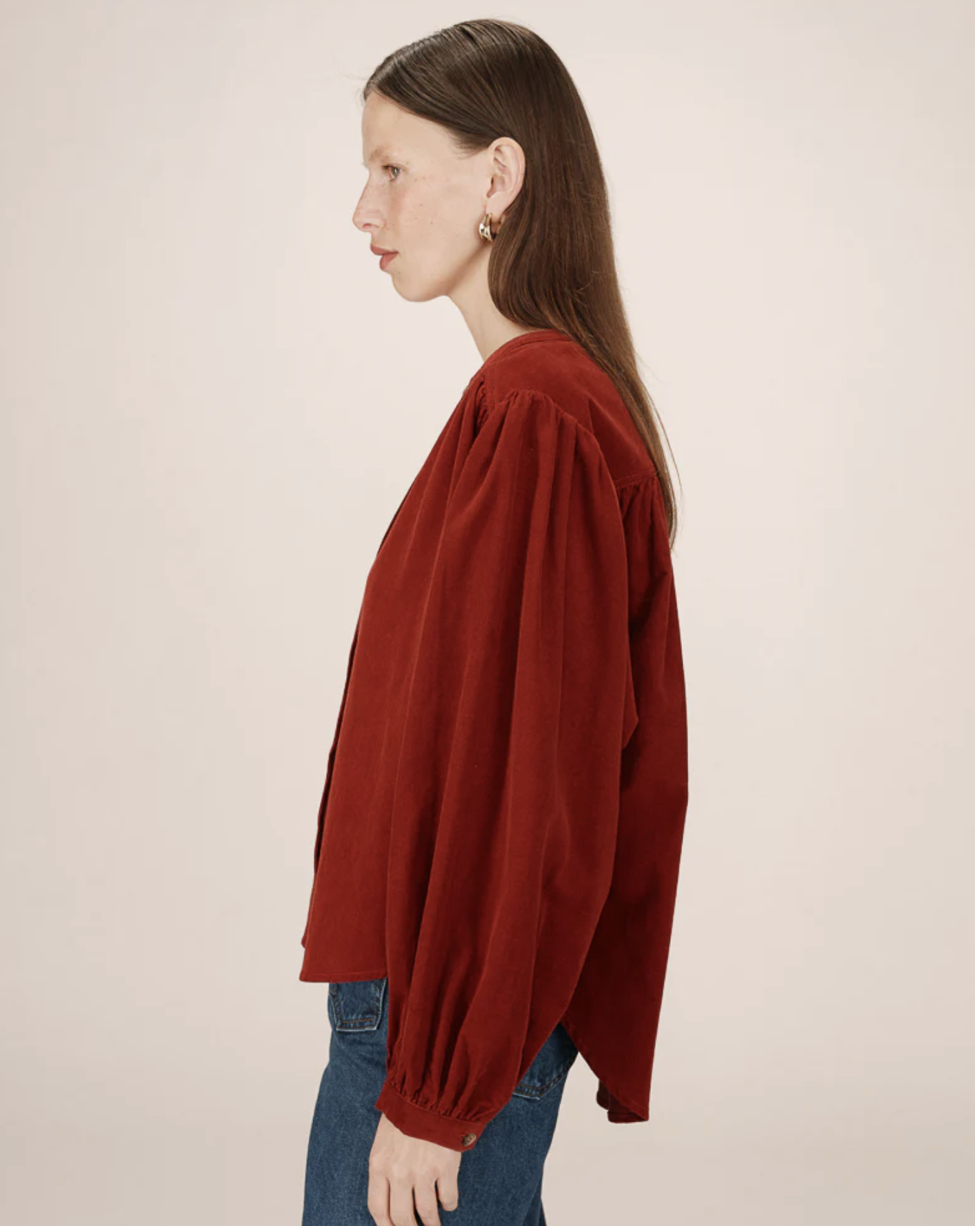 The SURI oversized blouse is made of 100% cotton corduroy and combines comfort with a retro style. The long puffed sleeves, accentuated by the buttoned cuffs, add a subtle touch of volume. The SURI velvet blouse features pleats at the shoulders and back, creating an elegant interplay of textures.