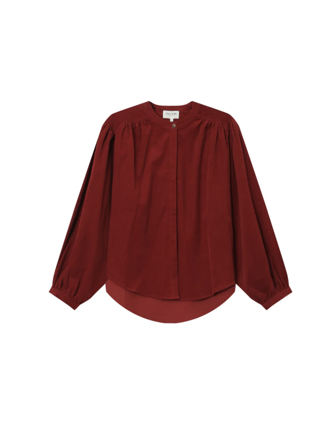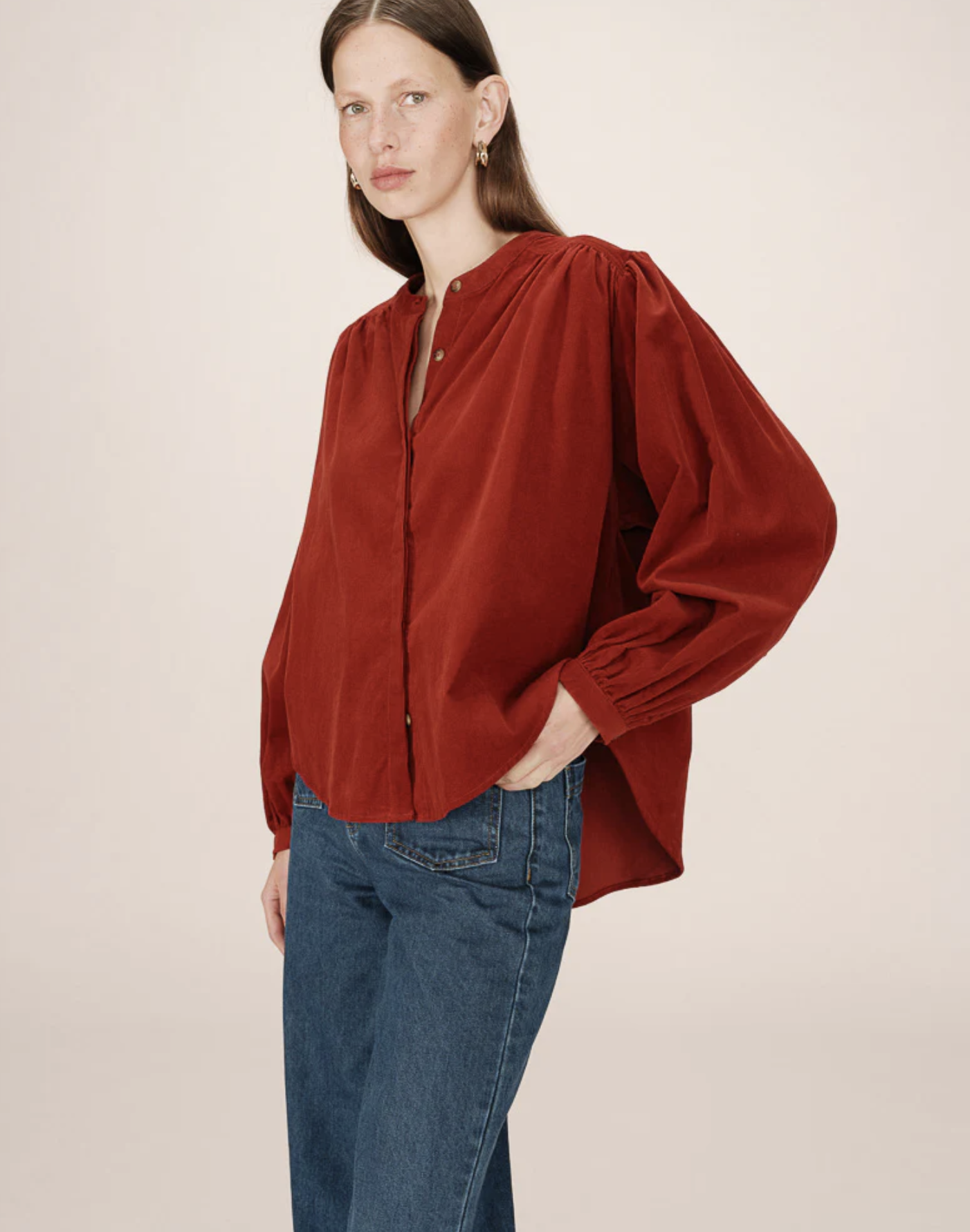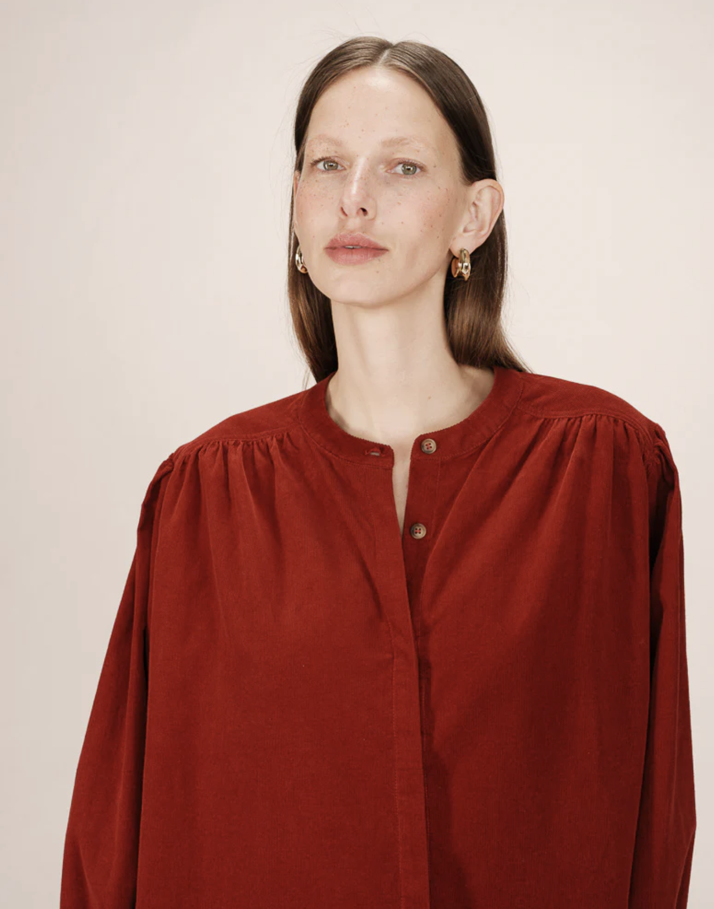 The SURI oversized blouse is made of 100% cotton corduroy and combines comfort with a retro style. The long puffed sleeves, accentuated by the buttoned cuffs, add a subtle touch of volume. The SURI velvet blouse features pleats at the shoulders and back, creating an elegant interplay of textures.