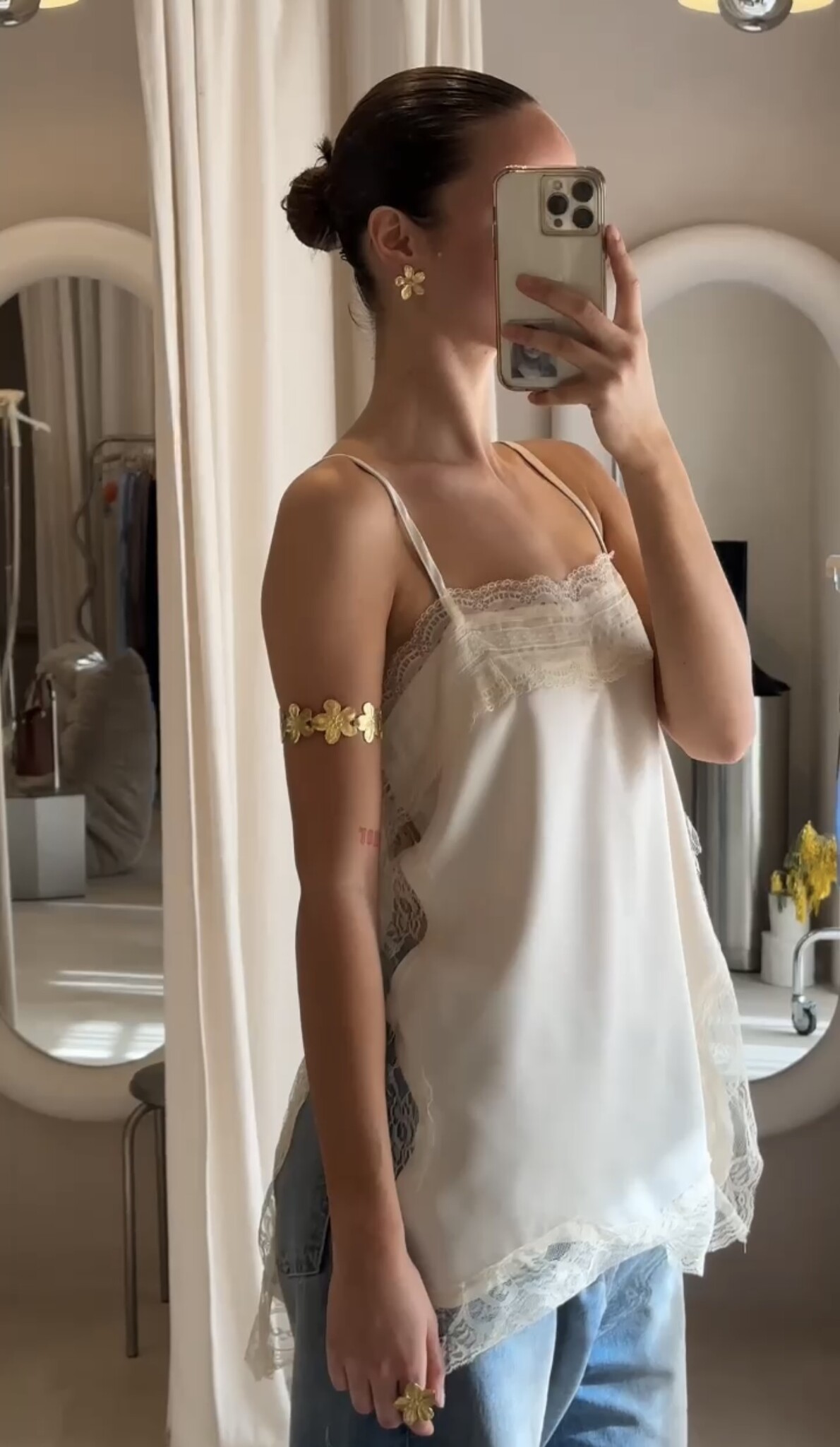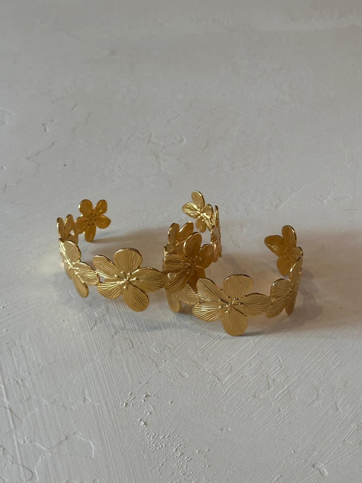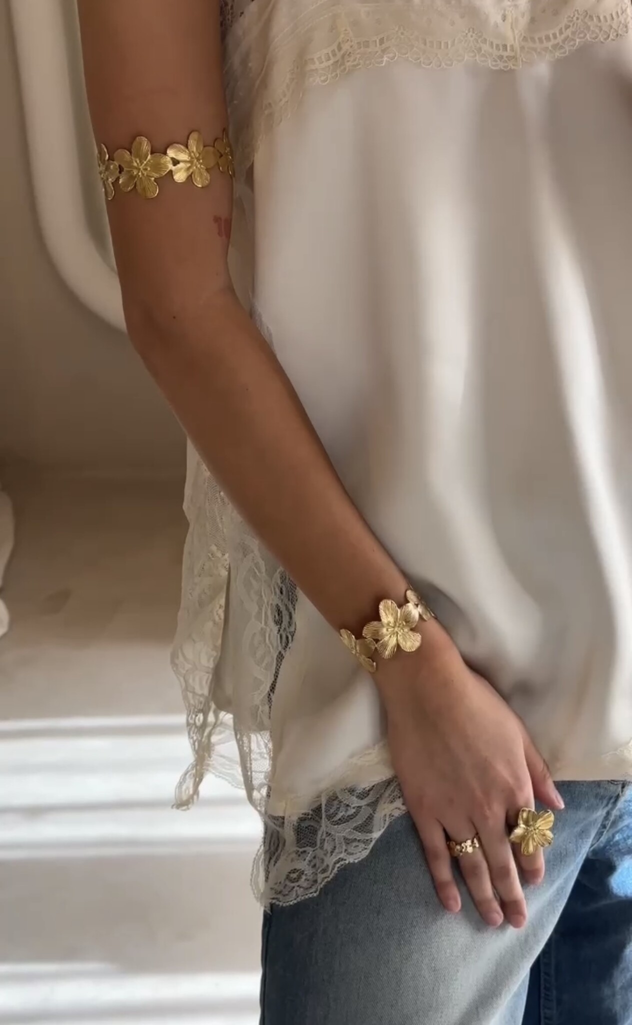 This sculptural cuff features a series of textured flowers that gracefully wrap around the arm. The design creates a soft, organic look while still feeling powerful and expressive.