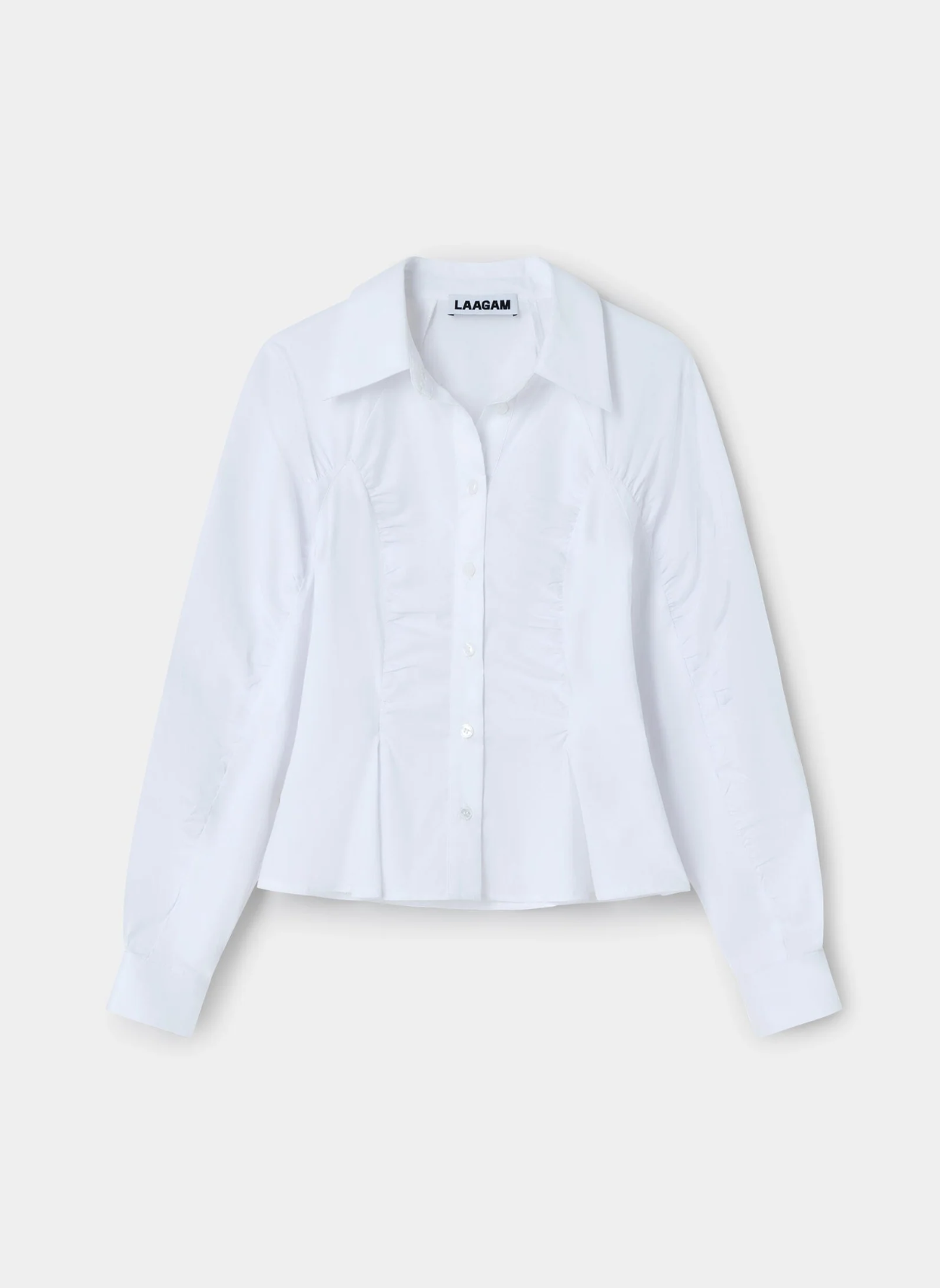 Long volume sleeves poplin shirt. Ruched seams along sleeve and body, both in front and back. Button-up closure. Flare pieces details in dusts and cuffs.