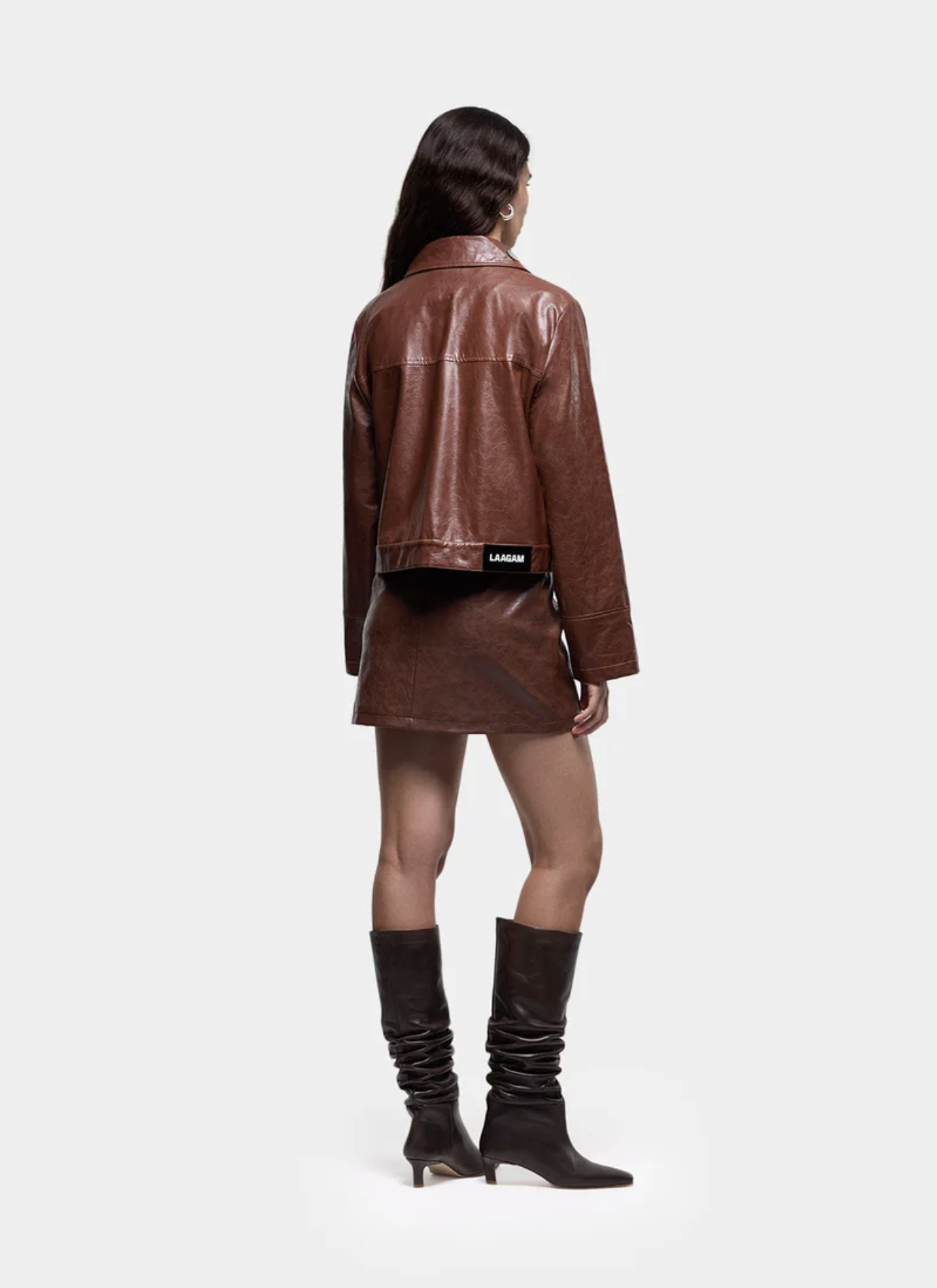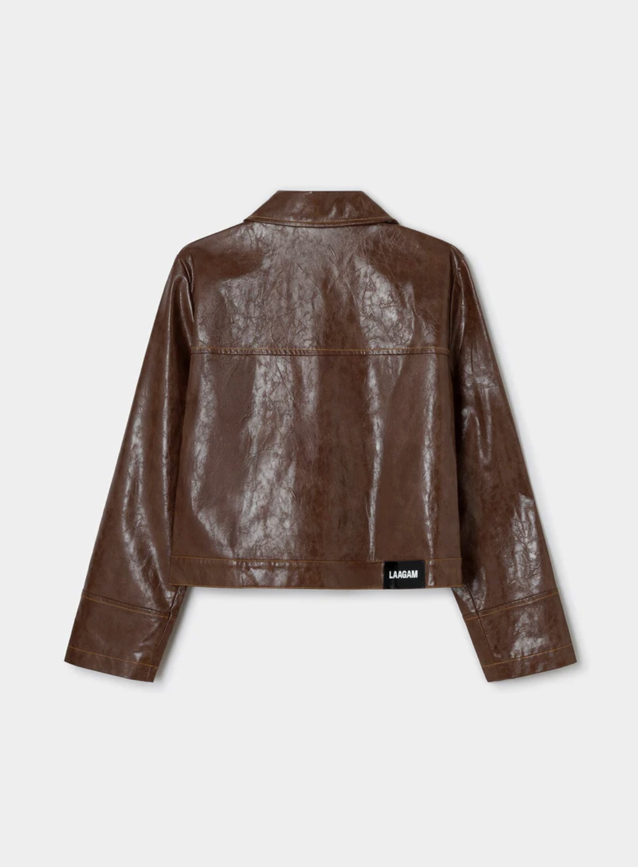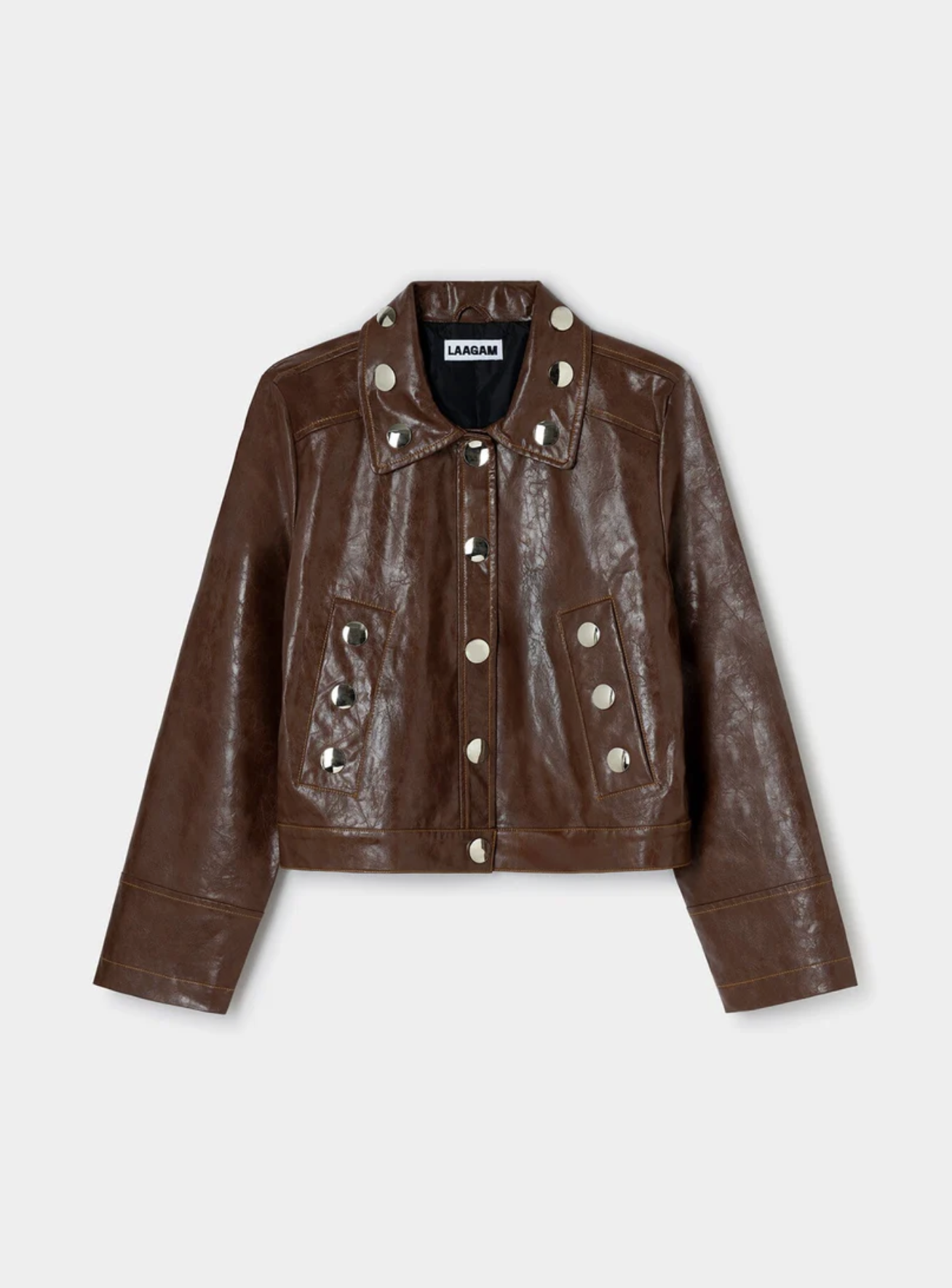 Short faux leather brown jacket with rounded hem collar. Silver metal buttons and details on collar and pockets. Interior black lining.