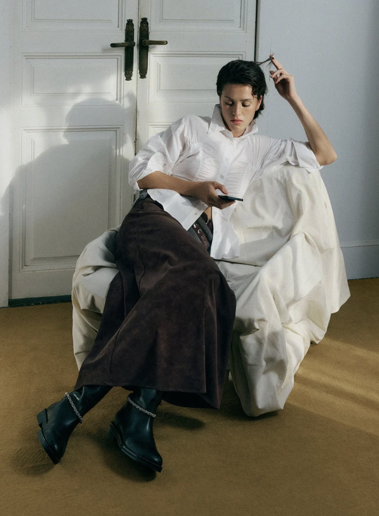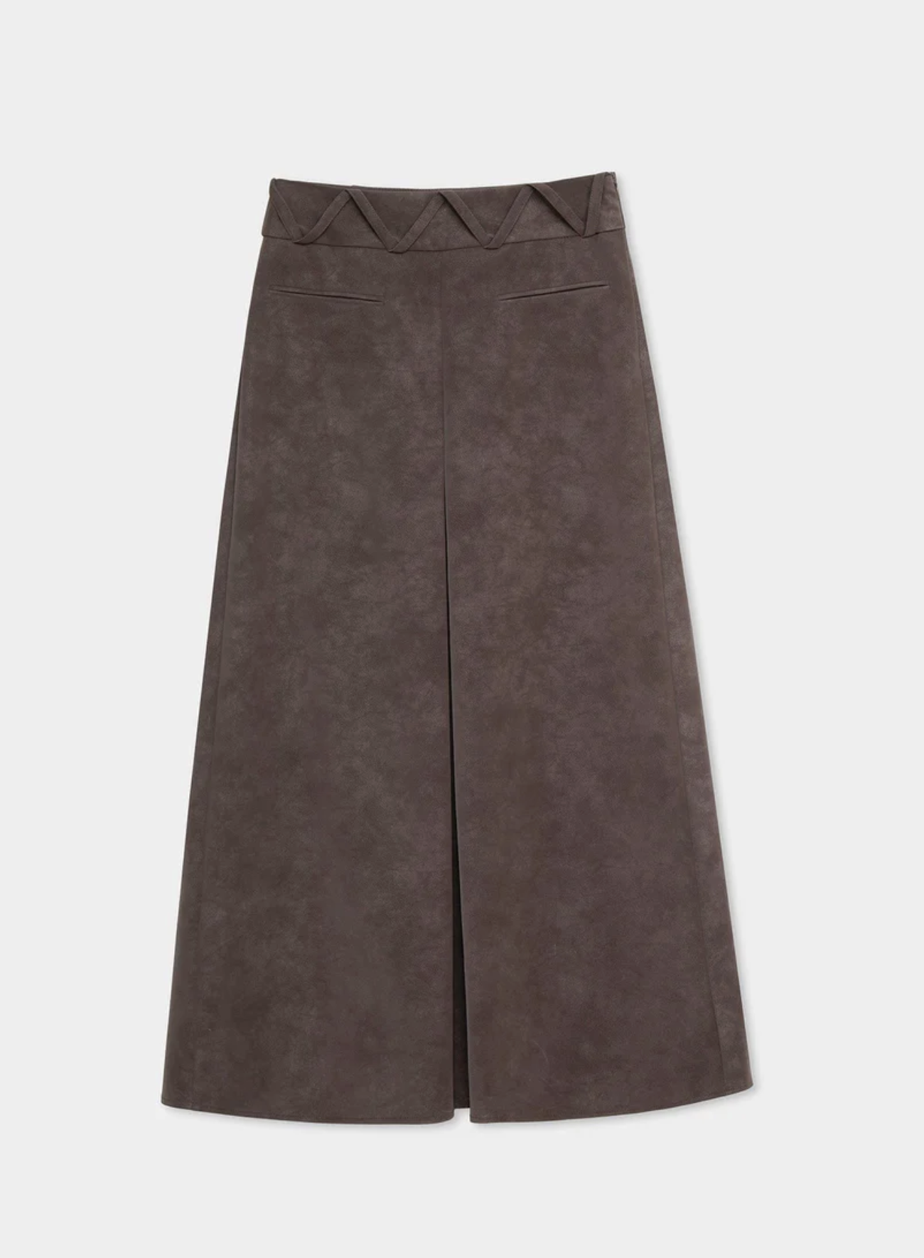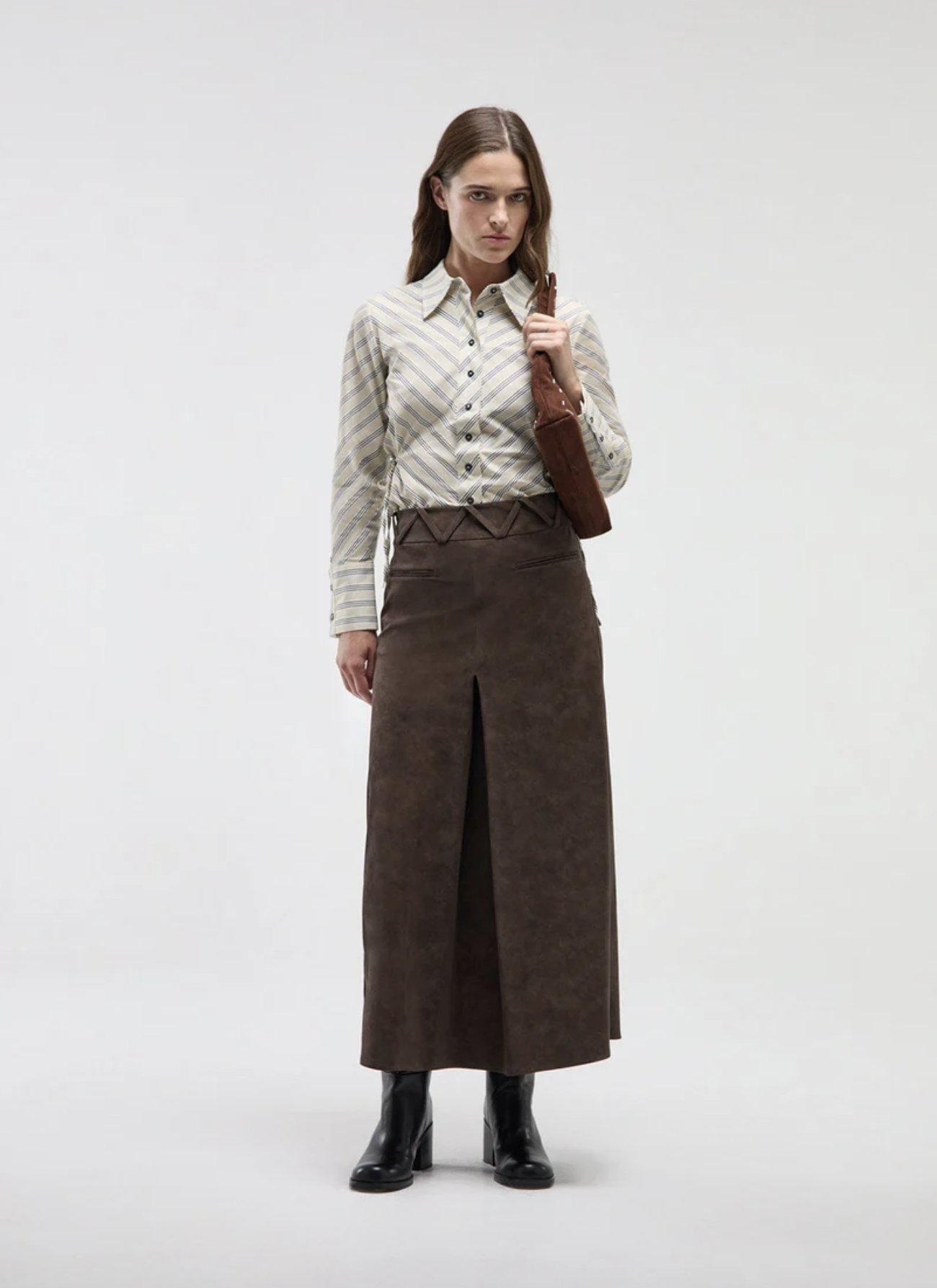High-waist, ankle-length, brown A-line skirt. It features an asymmetric front seam with pleats and inset pockets with flap closures. Waistband with zig zag shaped piping loops in contrast and closure on side by invisible zipper.
