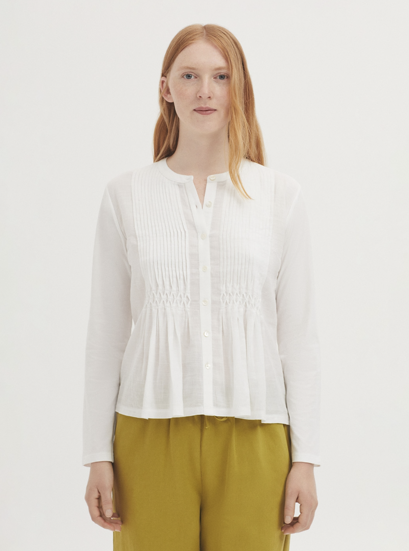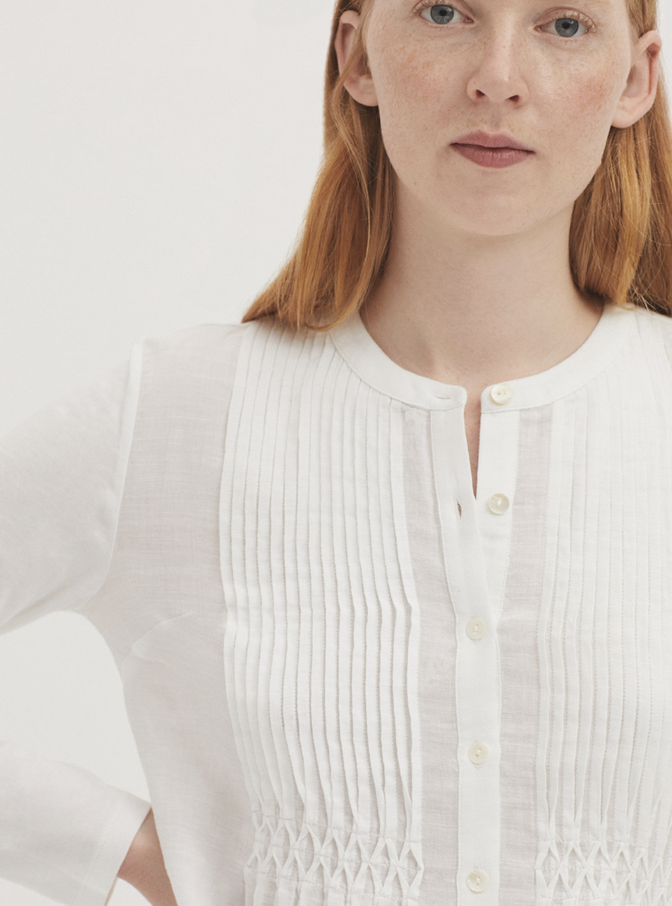 Sustainable cotton blend shirt. Round neck, centre fastening with buttons, long sleeves and pin tuck detail on the front.