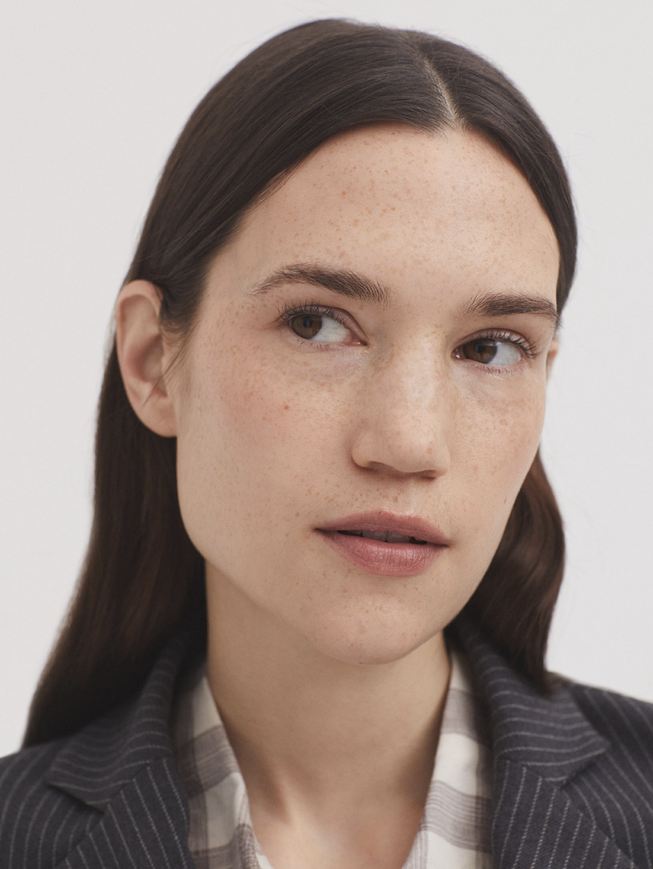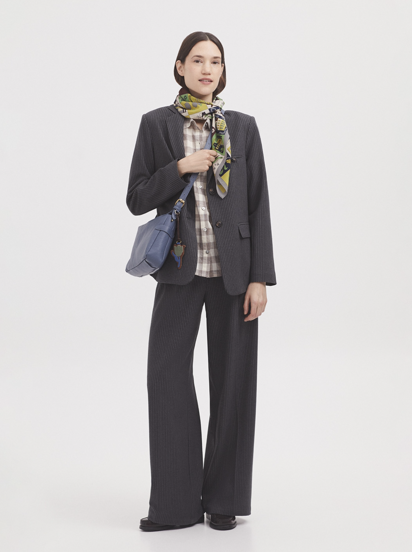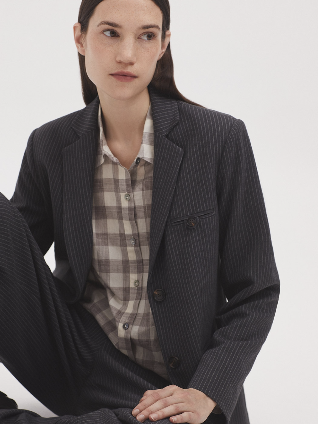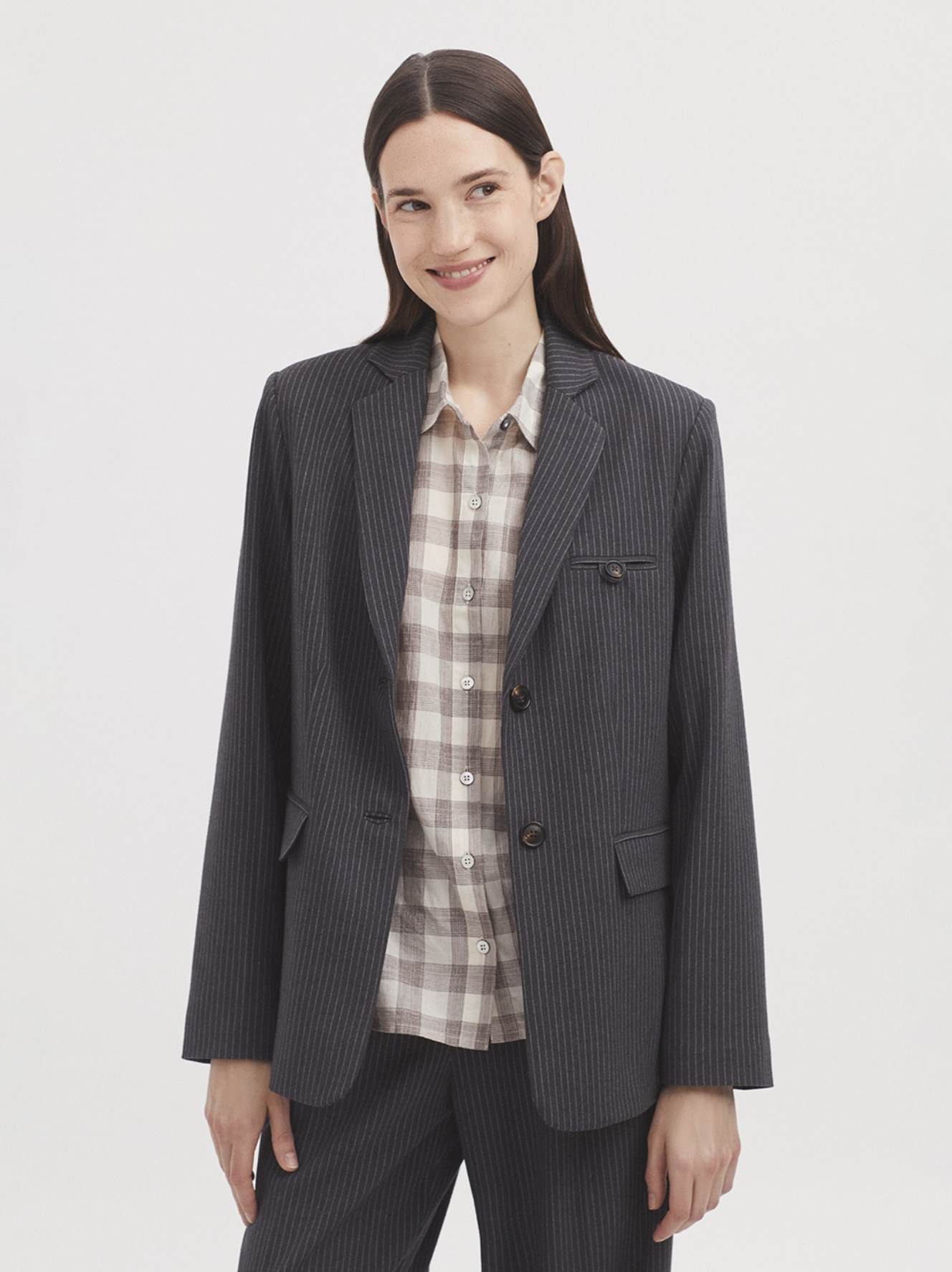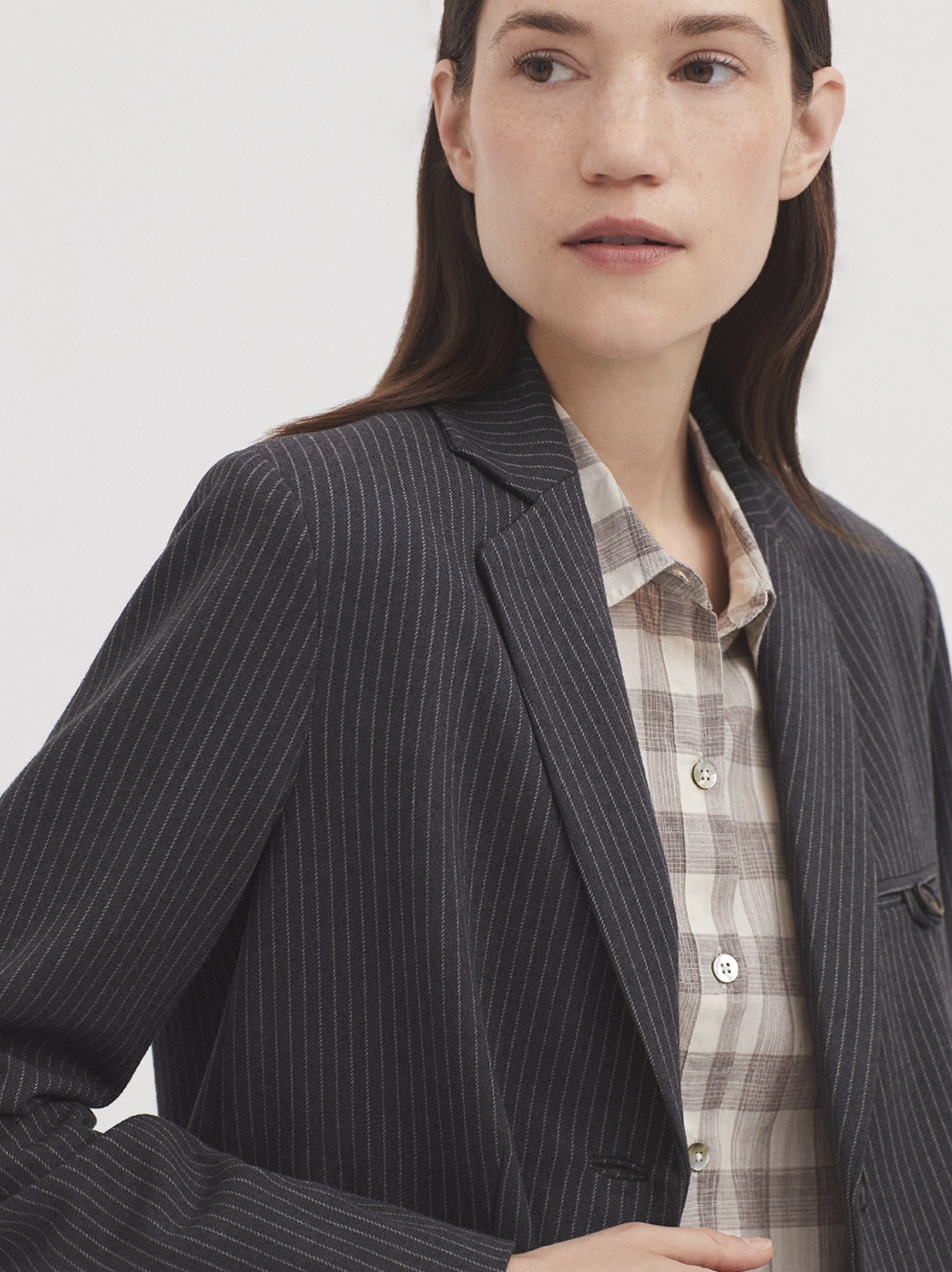 Blazer in pinstripe recycled polyester blend fabric. Notch lapels and button front. Flap pockets and jetted pocket on the chest. Tailored sleeves. Back vent. Lined.