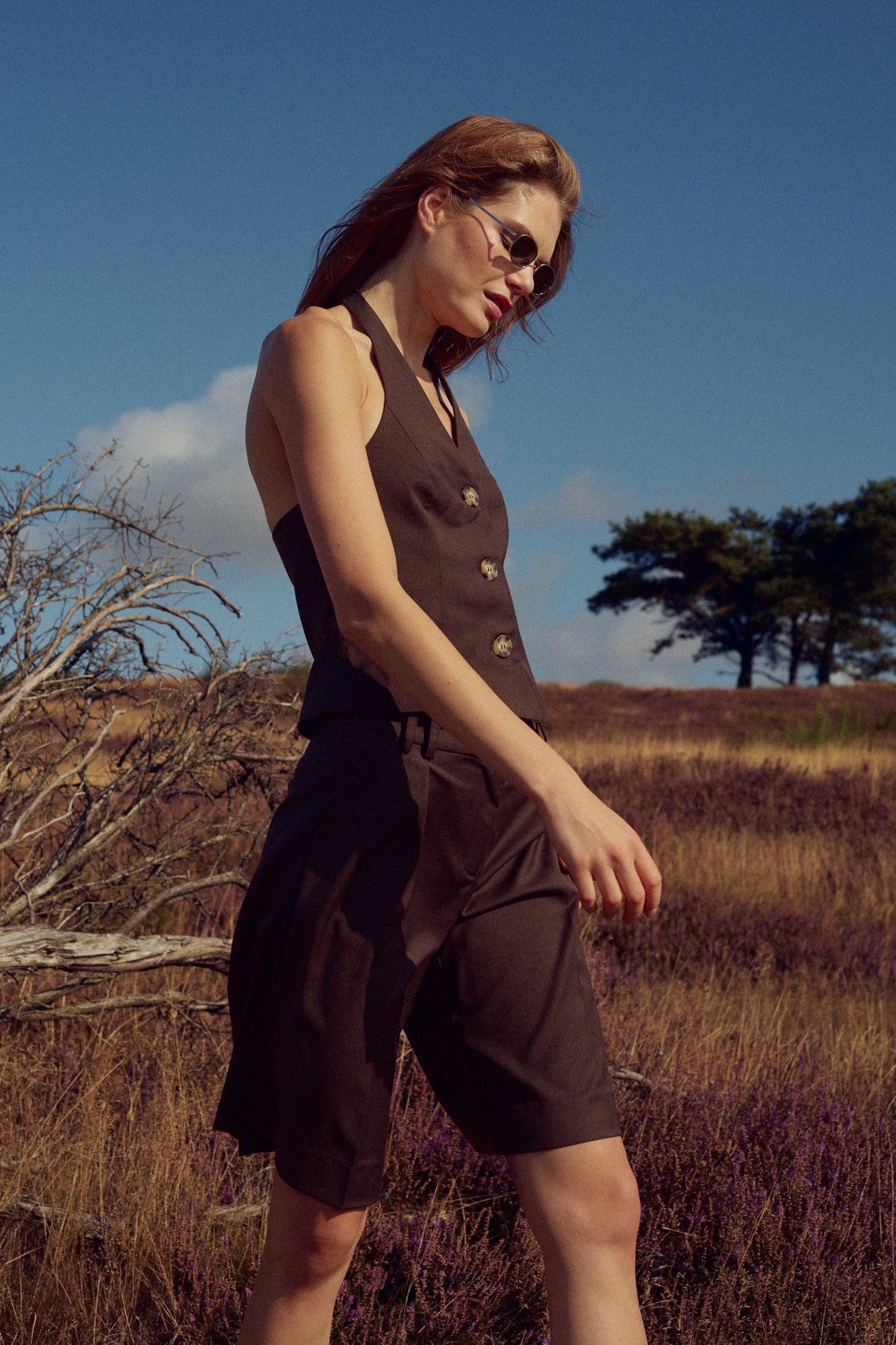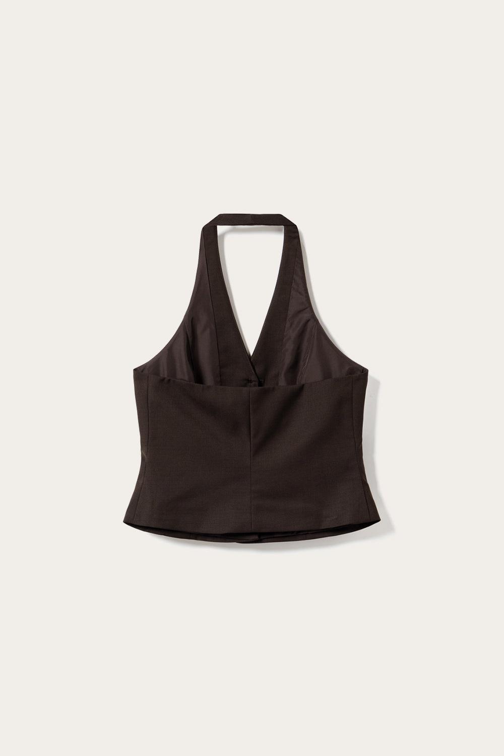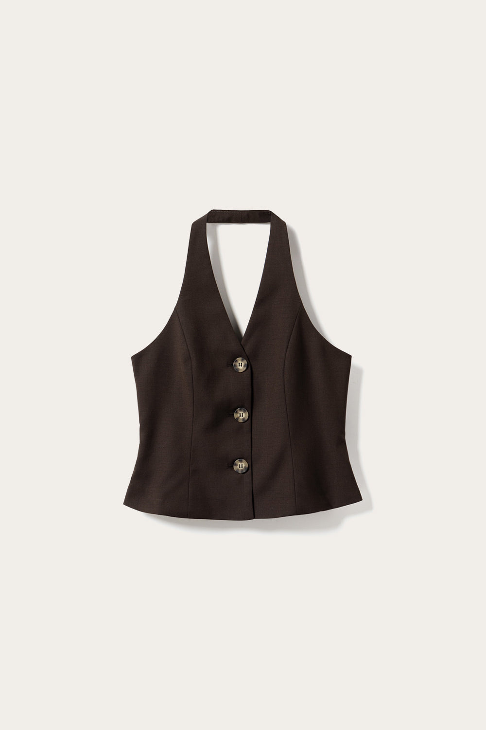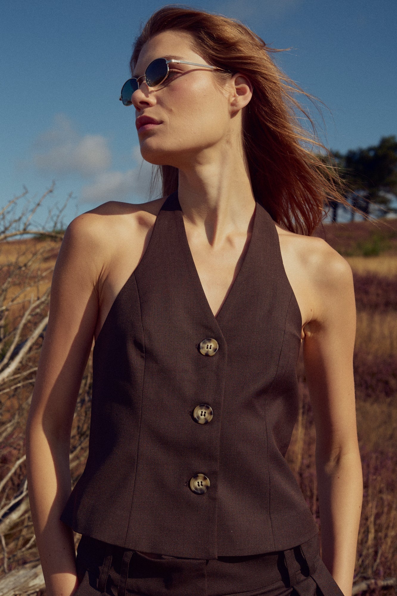 N-Martina Vest is a halterneck top with buttons at the front. It features princess seams for a flattering fit.