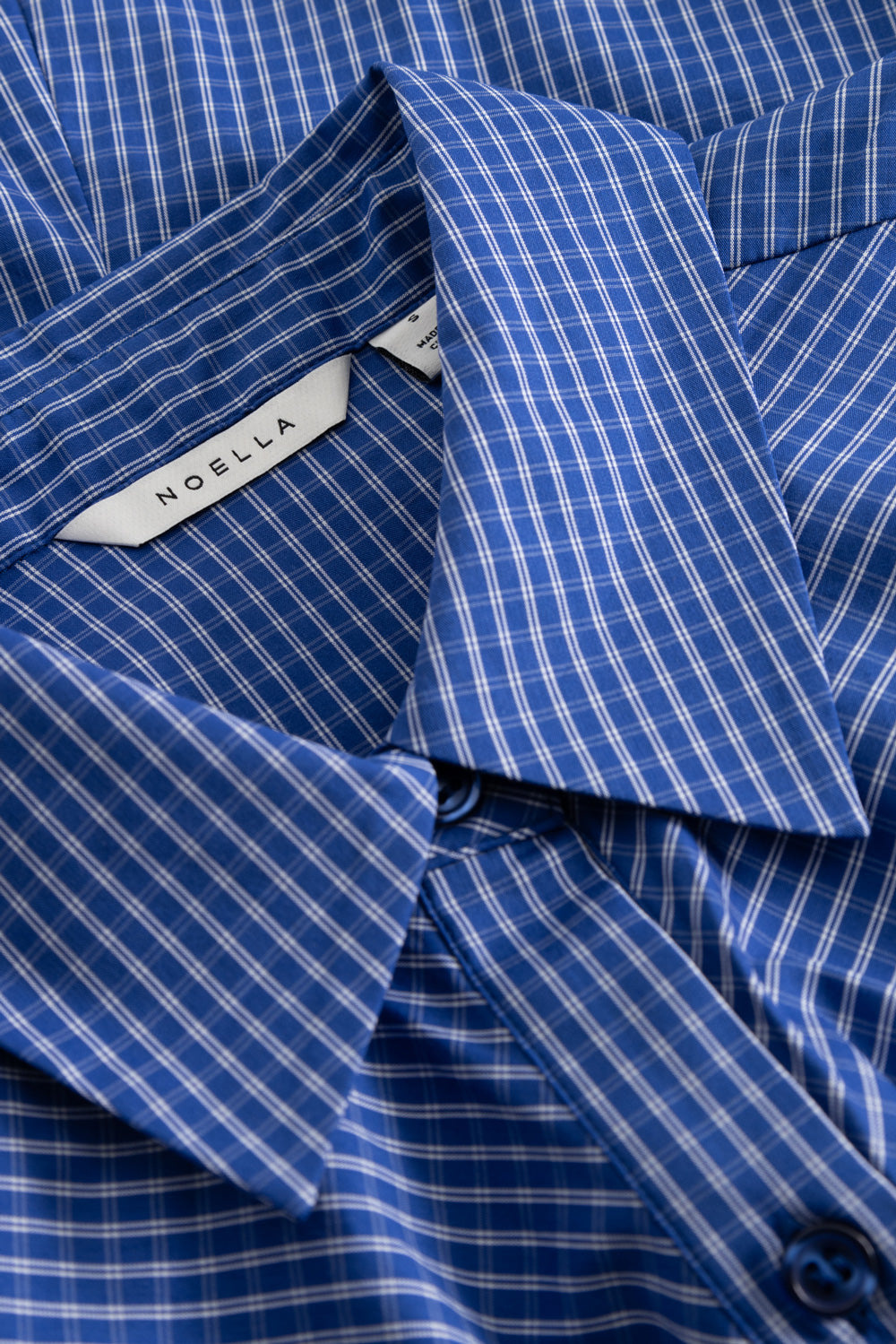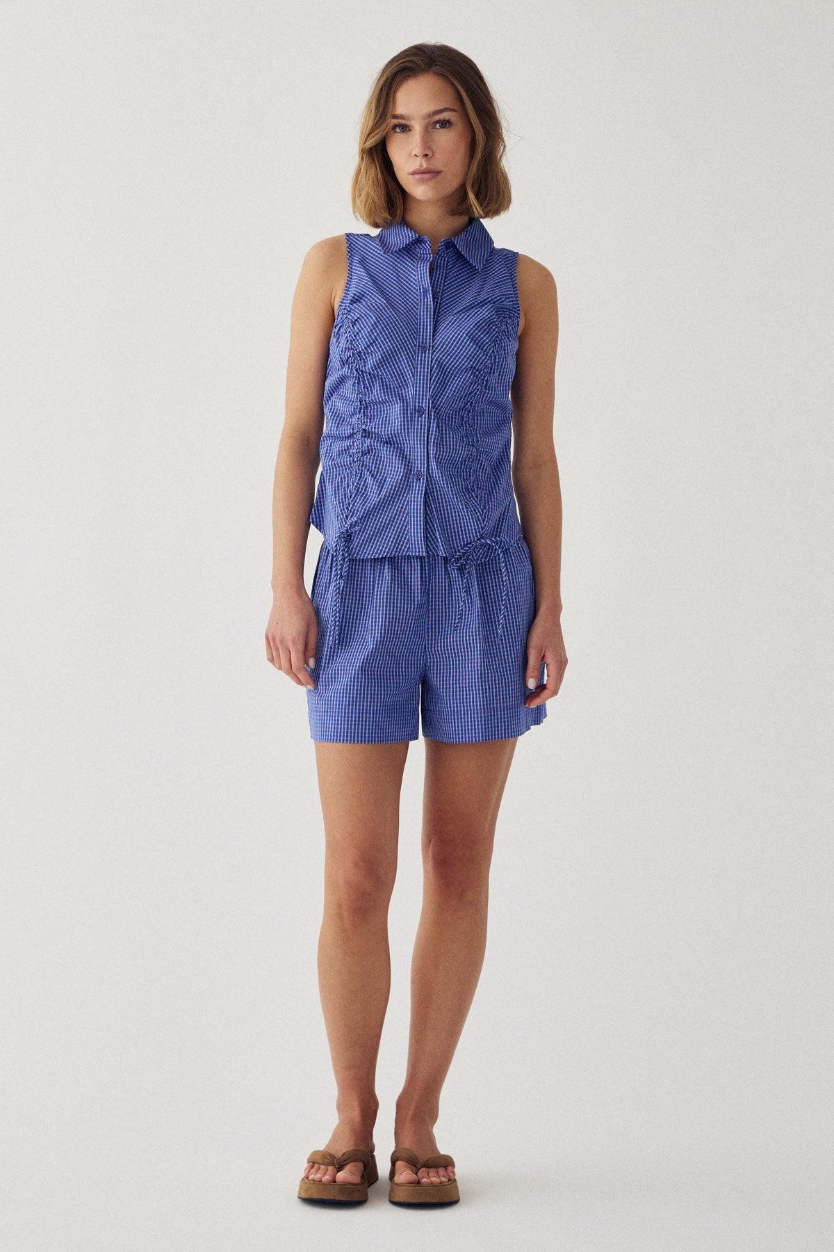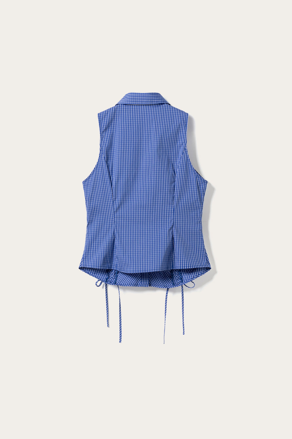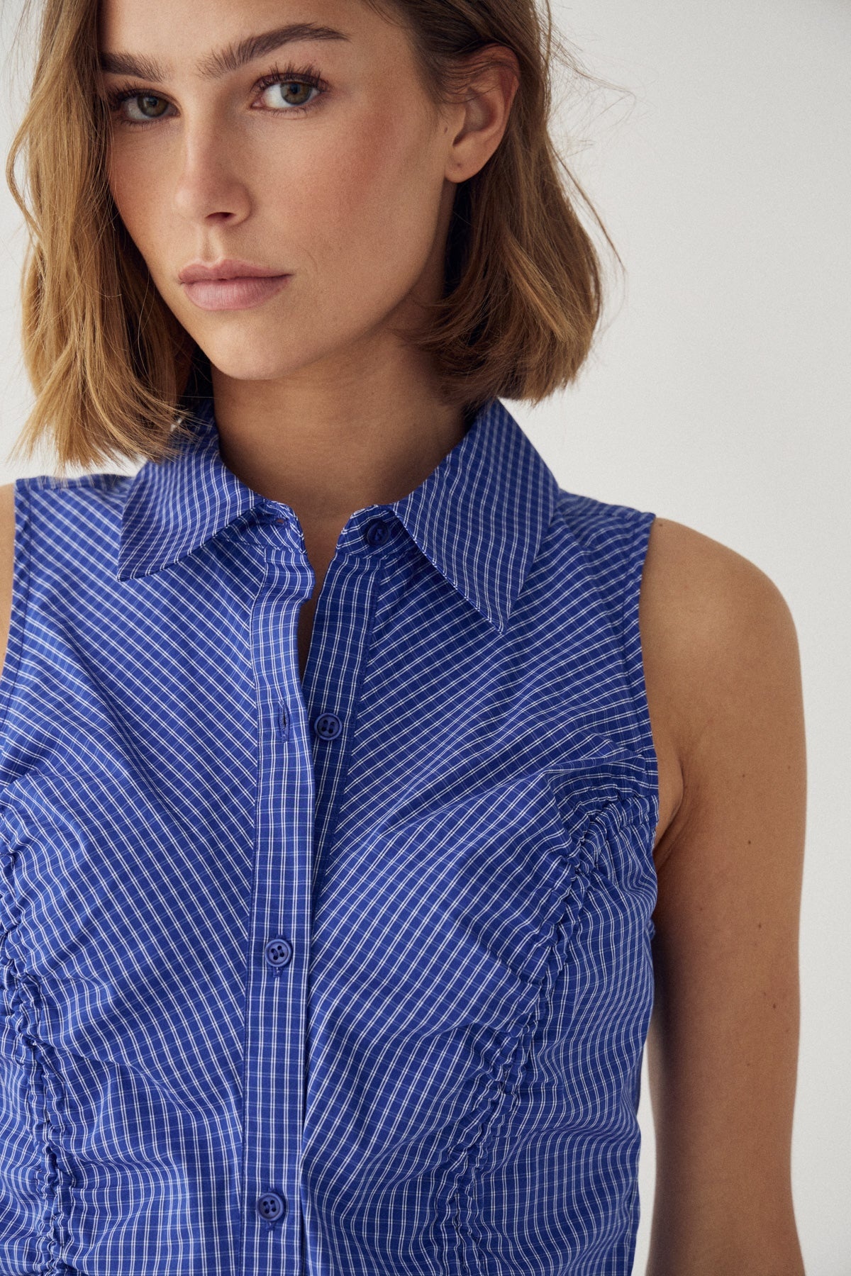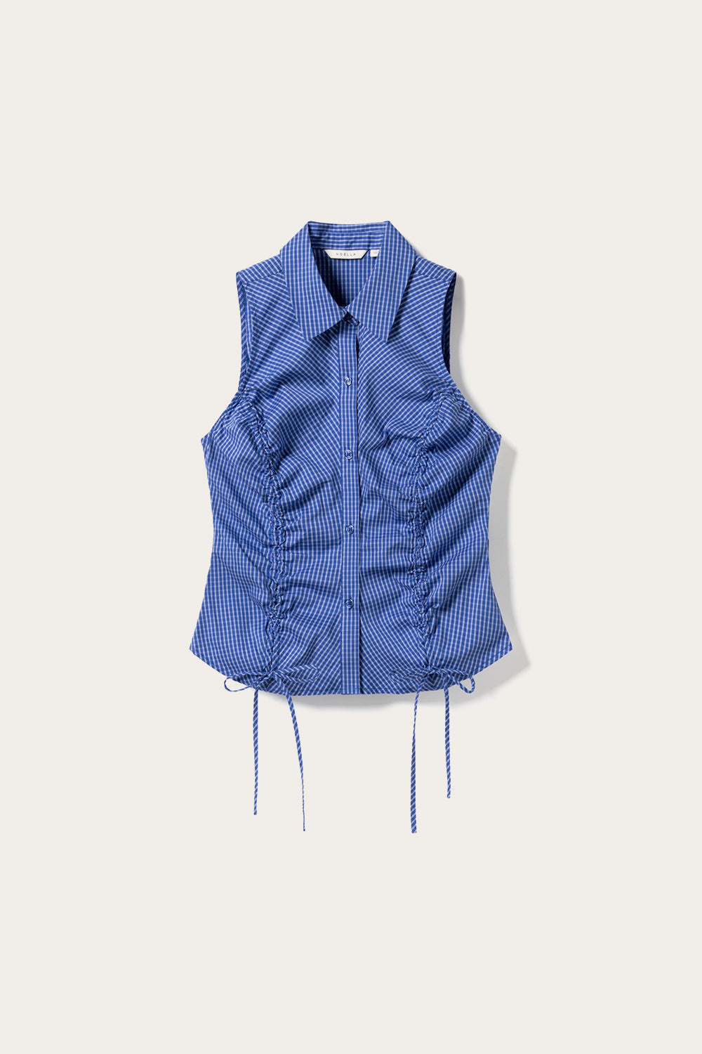 The N-Micaiah Blouse is a sleeveless blouse with buttons and a collar. It features a chest seam with tie straps that form soft pleats, adding shape and detail to the silhouette.