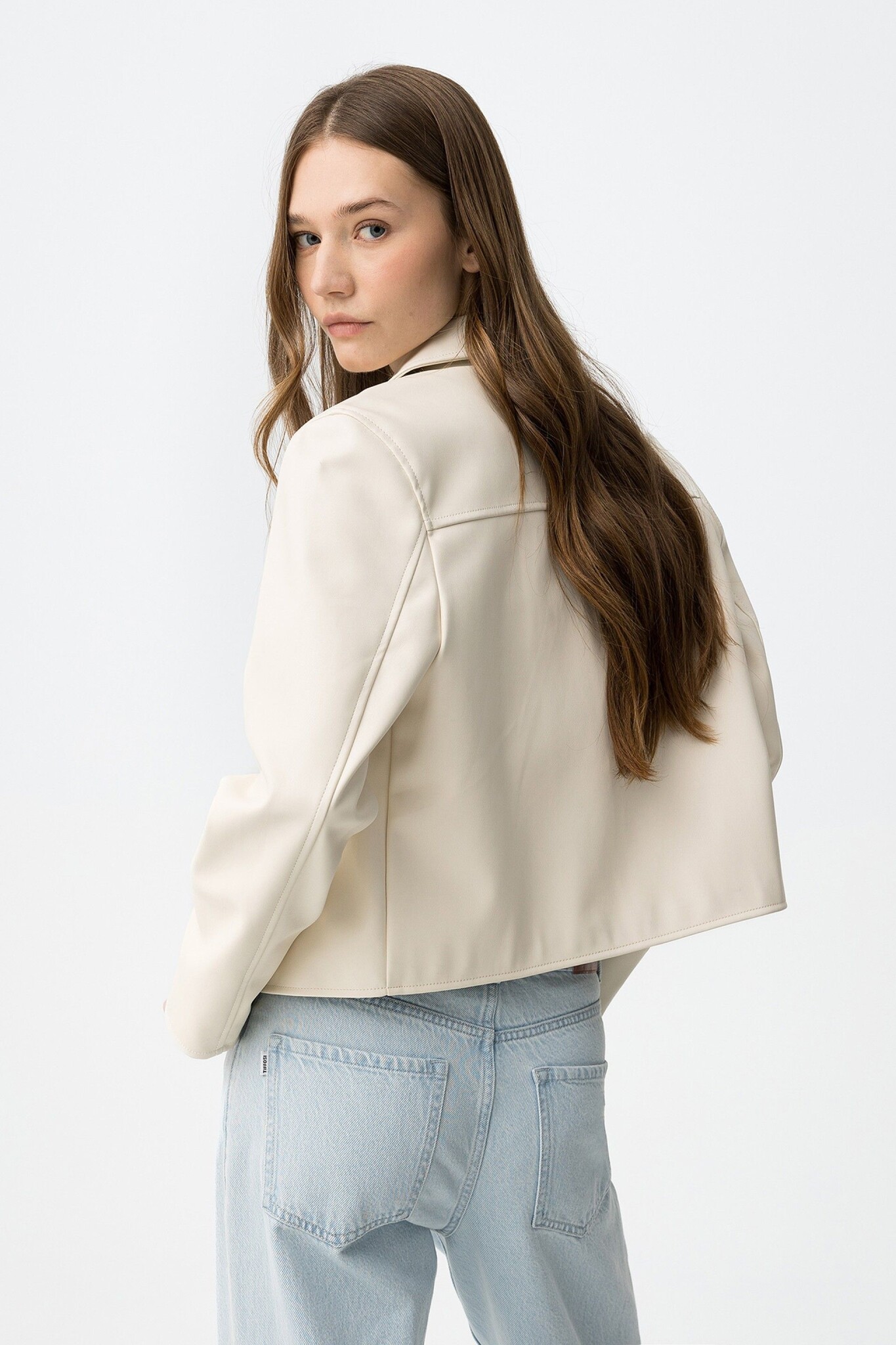 Beige jacket with classic collar, front buttons, regular fit, perfect for cool days.