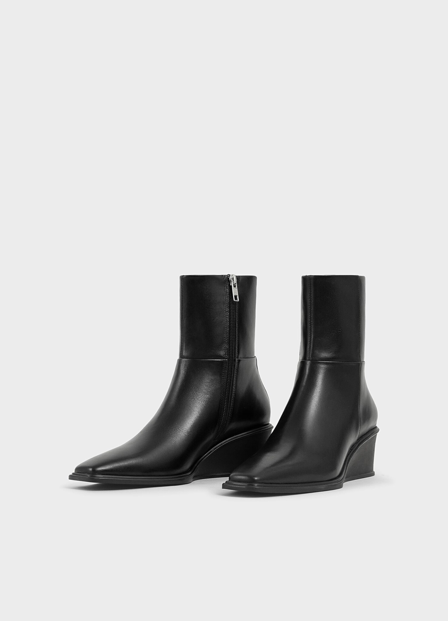 Aino is een modern enkellaarsje voor elke dag. De stijl is gemaakt van zwart leer en heeft een puntige neus en een ritssluiting aan de zijkant. Met een gestroomlijnde sleehak van 50mm.