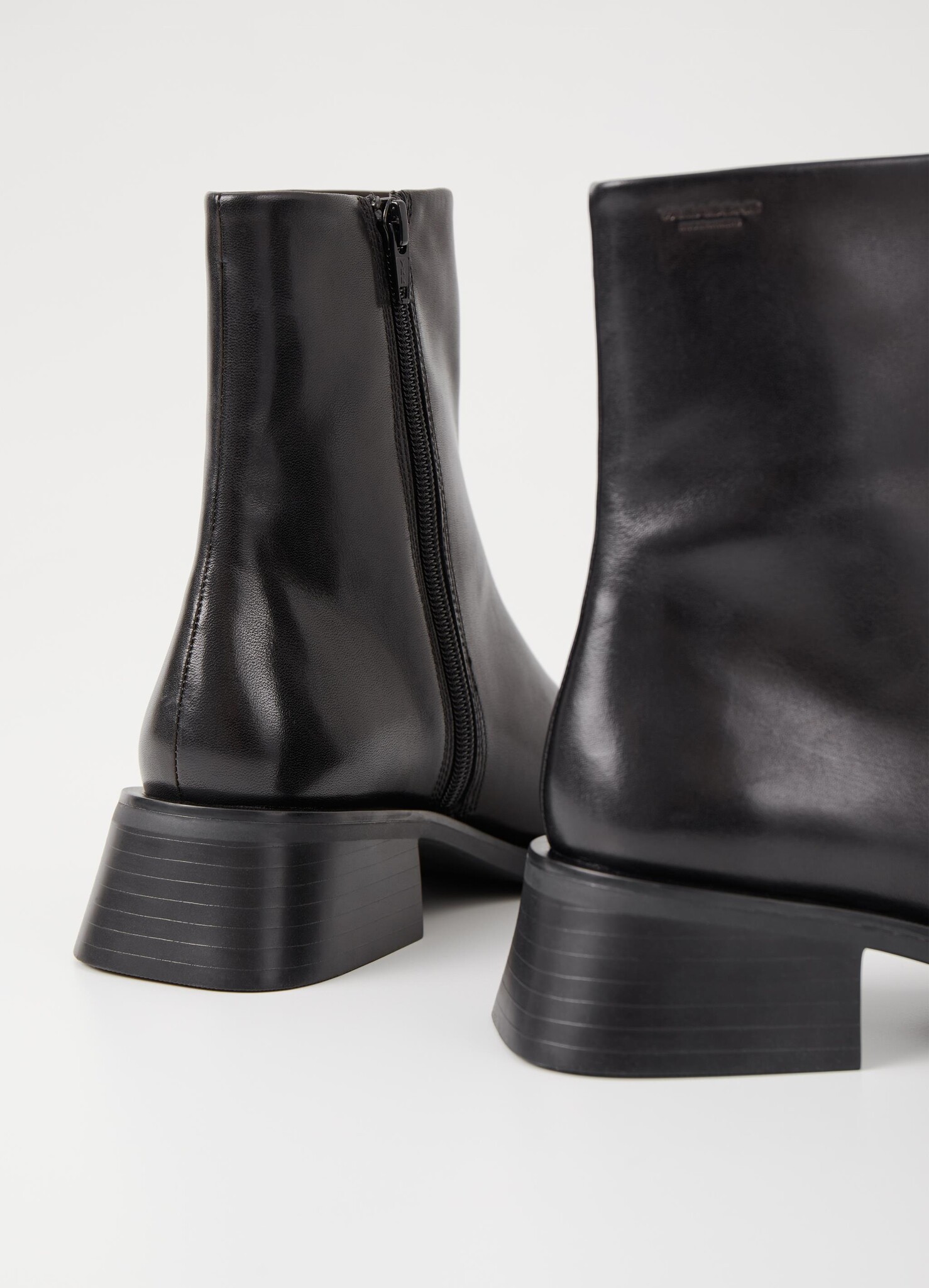 Blanca is een modern enkellaarsje met een minimalistisch design. De stijl is gemaakt van zwart leer en heeft een vierkante neus, rits aan de binnenkant en gedetailleerde naden langs het bovenwerk. De dunne zool heeft een uitlopende hak van 47mm.