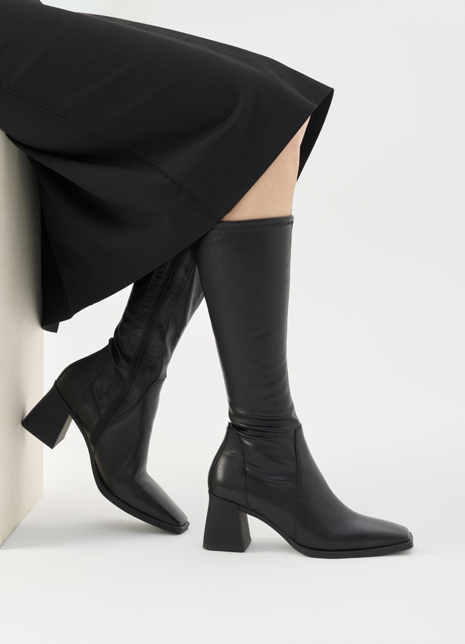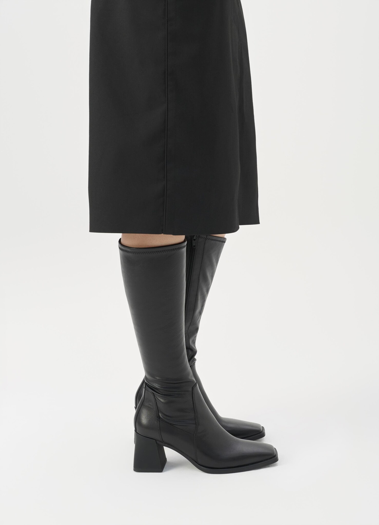 Edition Hedda is ontworpen om lang bij te blijven en is een tijdloze favoriet. De kniehoge laars heeft een bovenwerk van zwart leer en een schacht van rekbaar synthetisch leer. Afgewerkt met een ritssluiting aan de zijkant, een 70 mm hoge uitlopende hak en een subtiel vierkante neus. De binnenzool is gemaakt van chroomvrij leer.