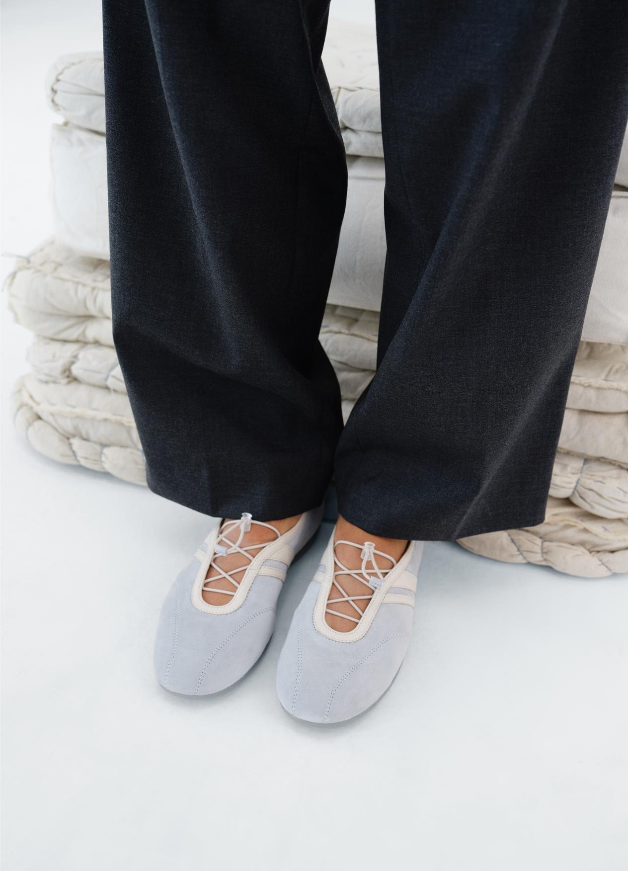 Hollie draws inspiration from racing design, which translates into a streamlined silhouette with a soft and flexible construction. The style combines sneaker design with a ballerina silhouette and is crafted from light blue suede.