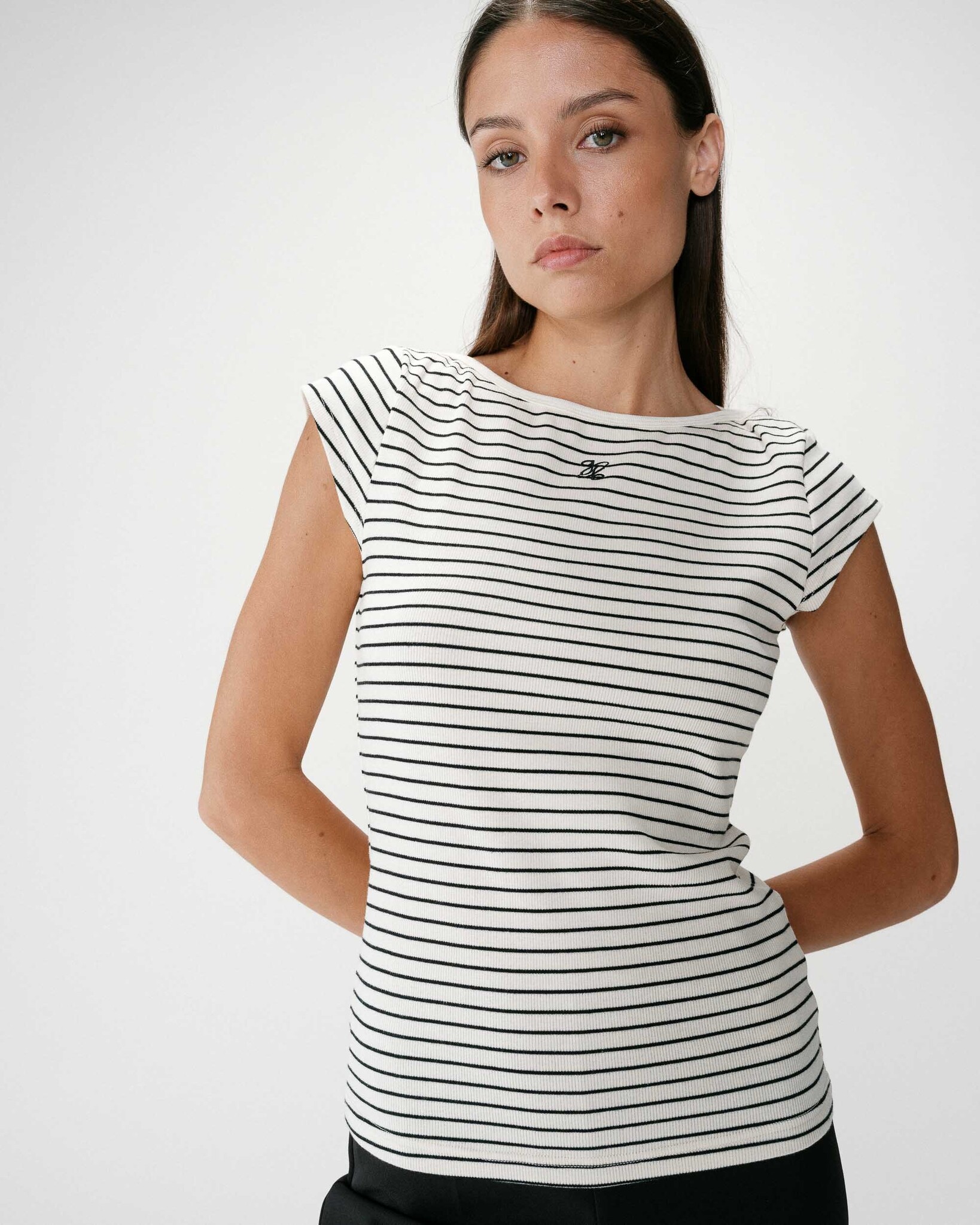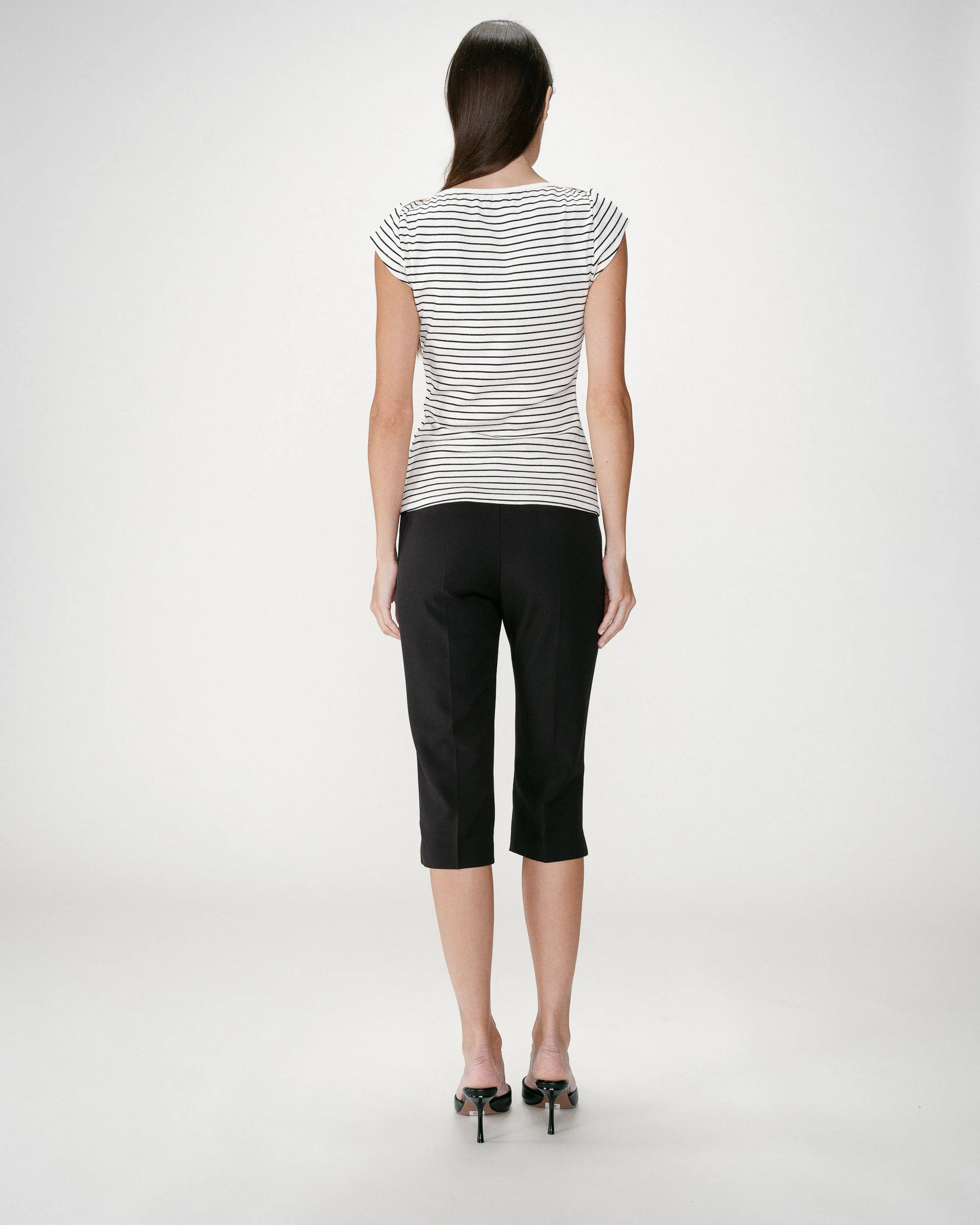 Combineert u het met: De gestreepte top WAKE wordt gedragen met de zwarte capri WHERE voor een nonchalante en vrouwelijke look.