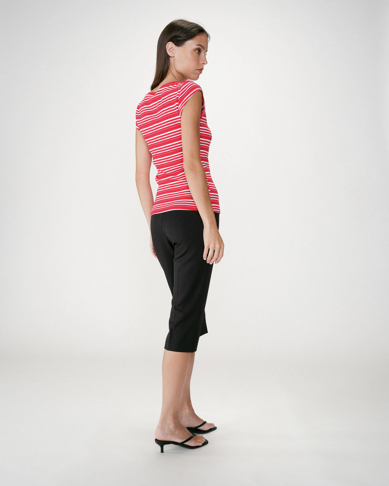 Combineert u het met: De gestreepte top WAKE wordt gedragen met de zwarte capri voor een nonchalante en vrouwelijke look.