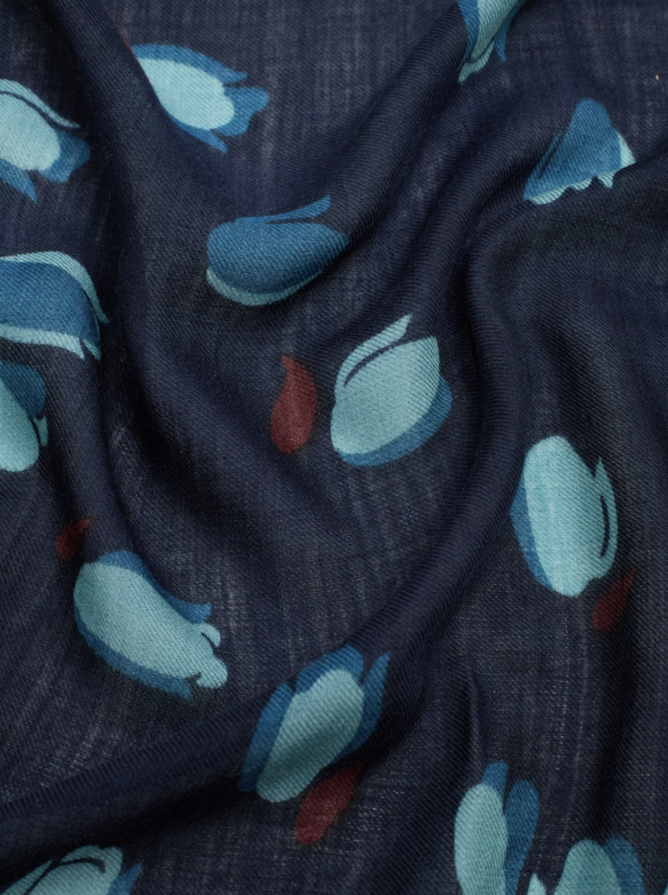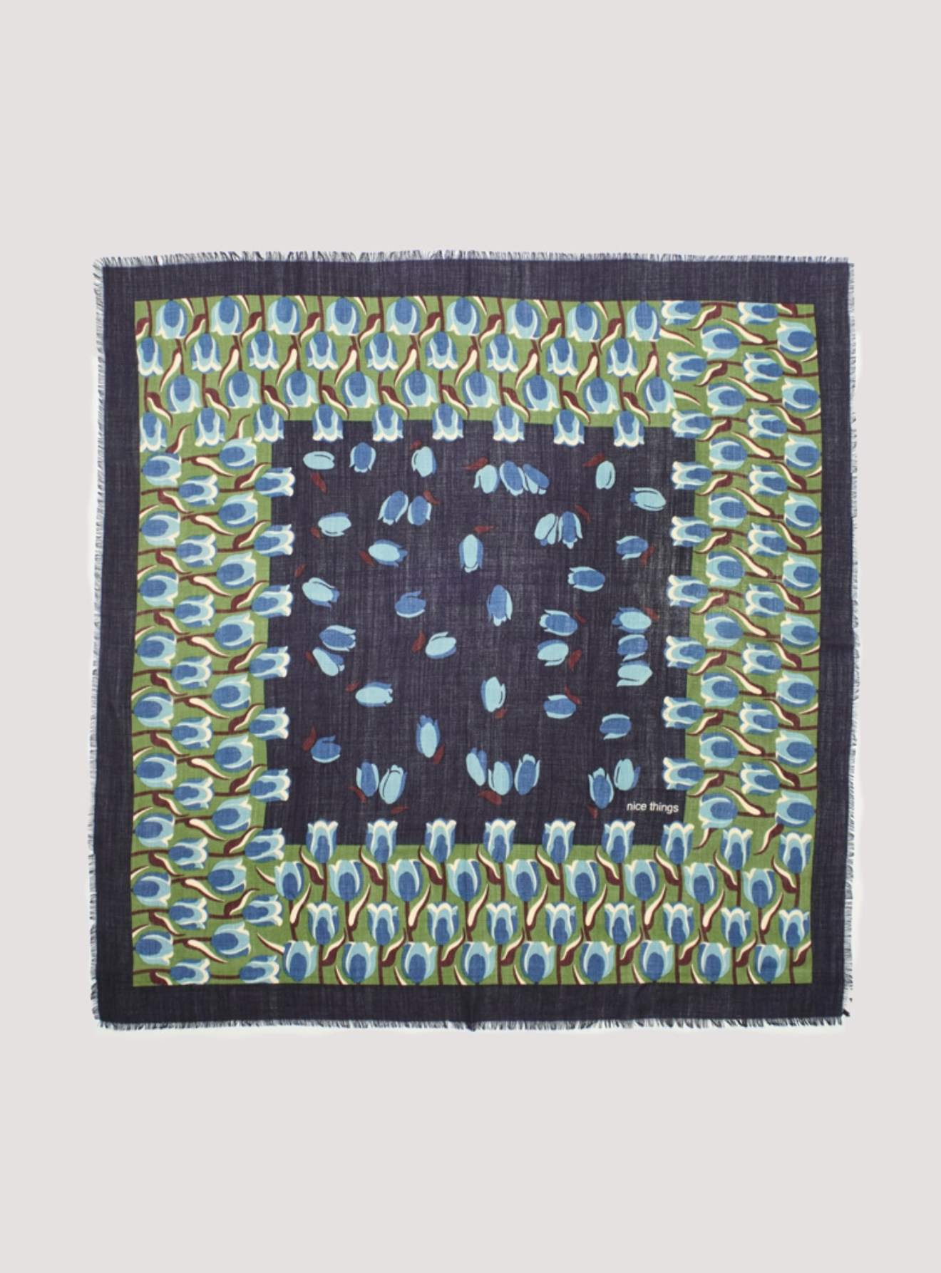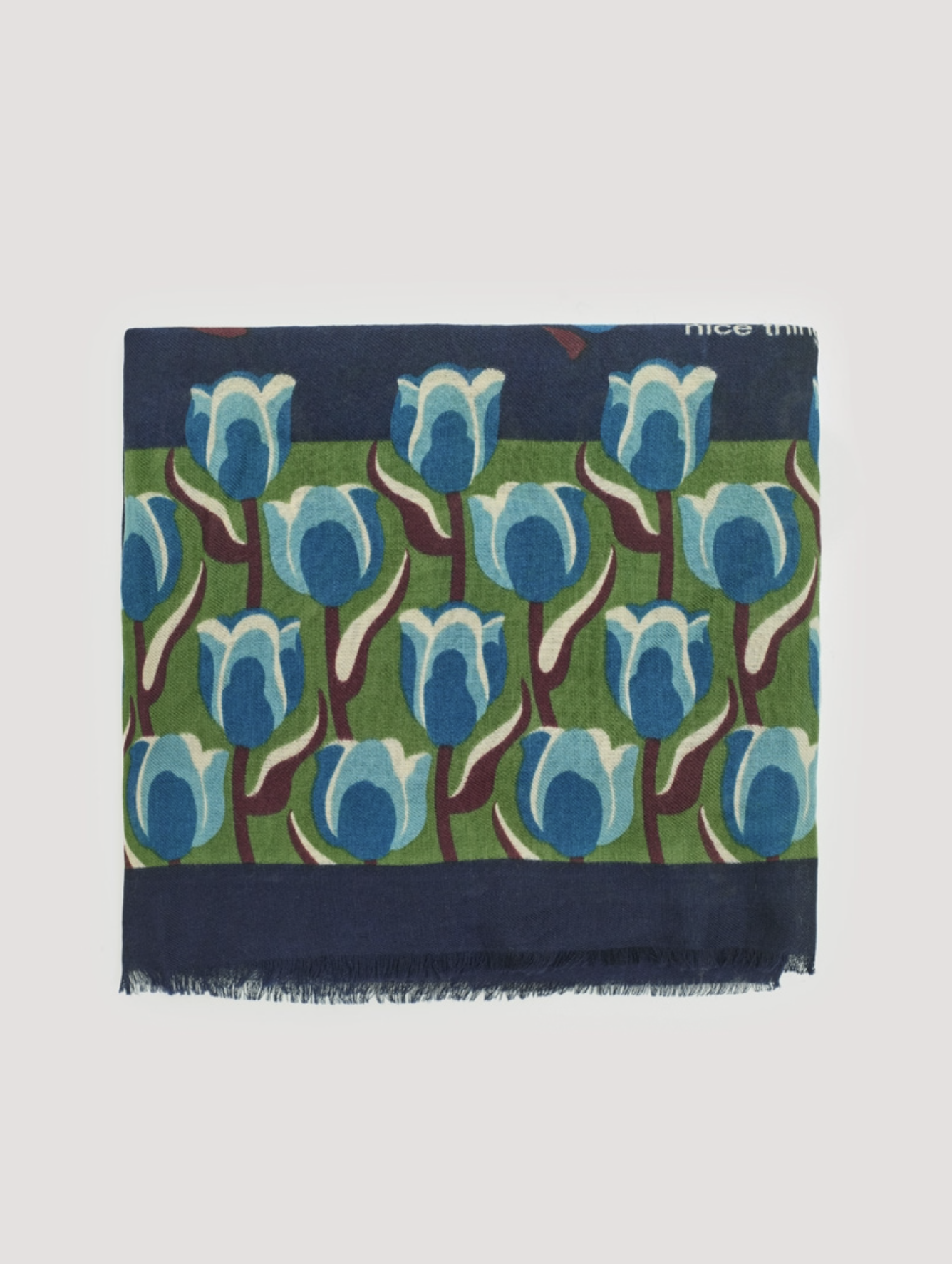 Sjaal met Tulpentuinprint. 55% viscose - 45% wol. Afmetingen: 100 x 100 cm.