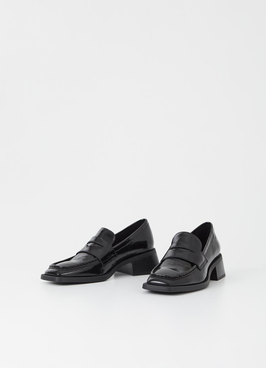 Dressy penny loafers Blanca channels a sophisticated design. The model is crafted in black patent leather, featuring square toes and a decorative penny strap across the vamp. The style is complemented with 47mm flared heels.