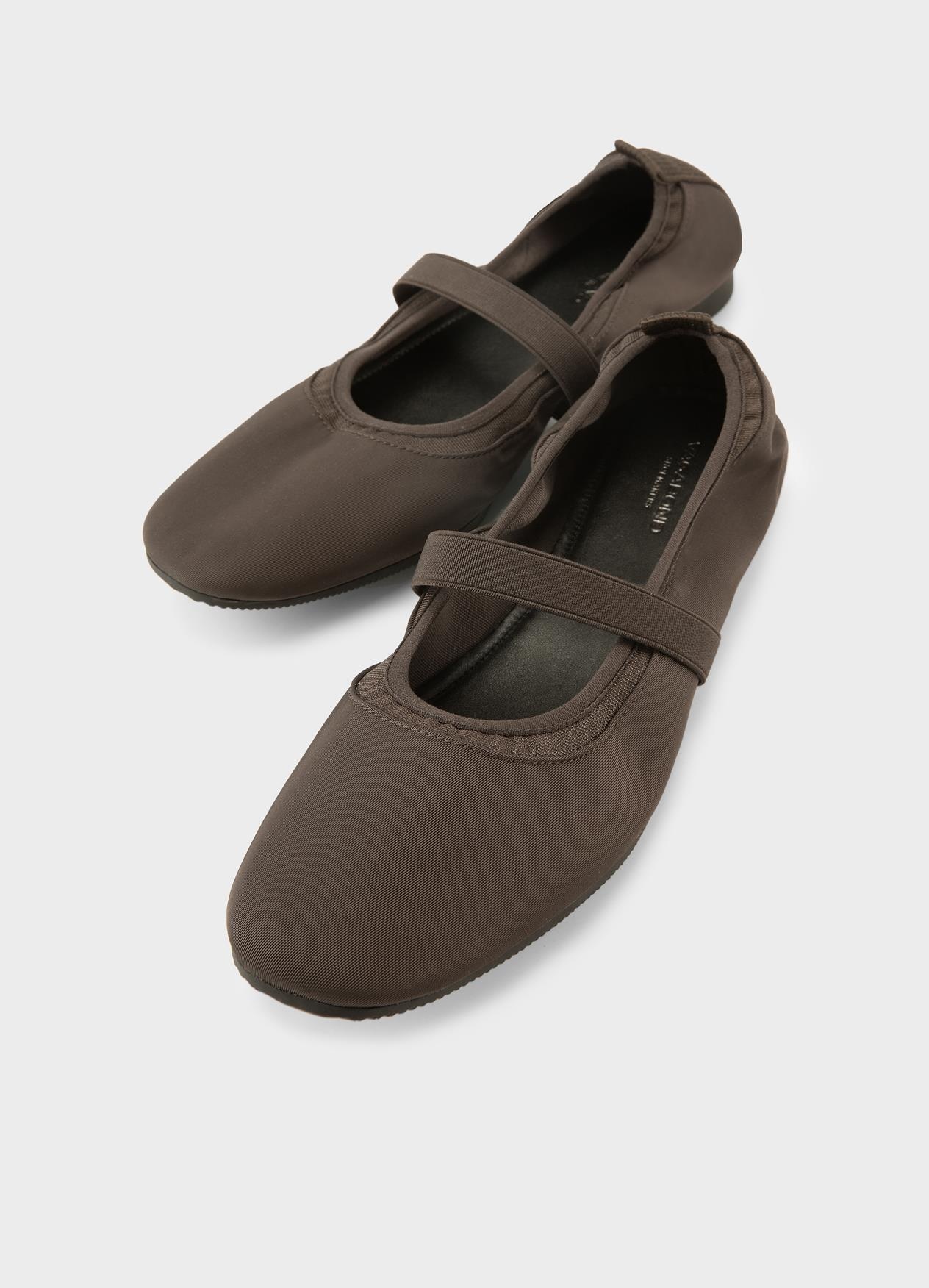 Hillary is onze sportieve hybride, een moderne variant op de klassieke ballerina. Deze ballerina is gemaakt van donkerbruin textiel en heeft een elastisch bandje over het bovenwerk.