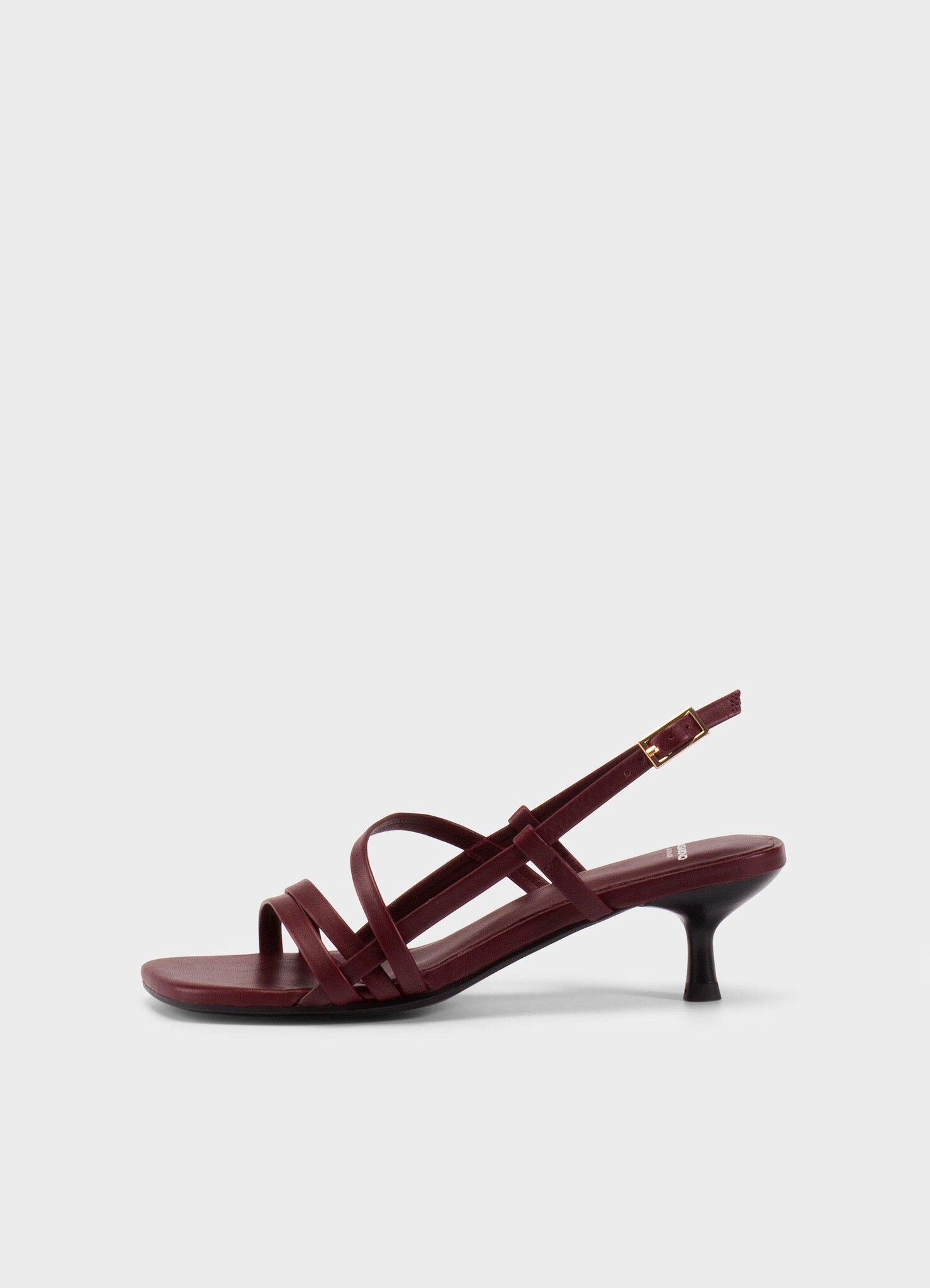 Jonna is onze versie van de sandaal met bandjes. De verfijnde stijl is gemaakt van kersenrood leer en heeft een verstelbaar slingback bandje met een gespsluiting. De kitten hak is 47 mm hoog, en de stijl is afgewerkt met een leren binnenzool.